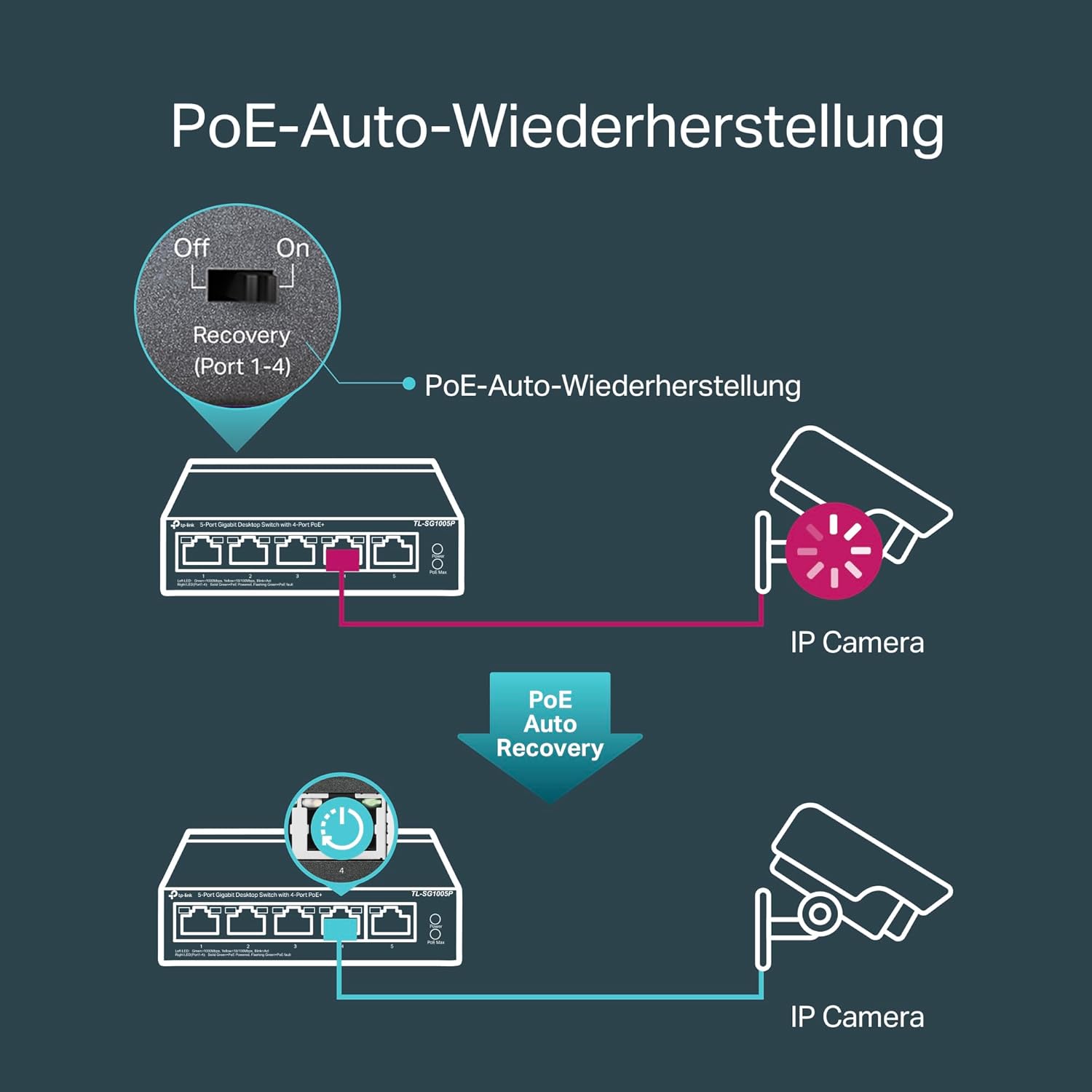 - Lieferumfang: TL-SG1005P, Schnellinstallationsanleitung, Netzteil