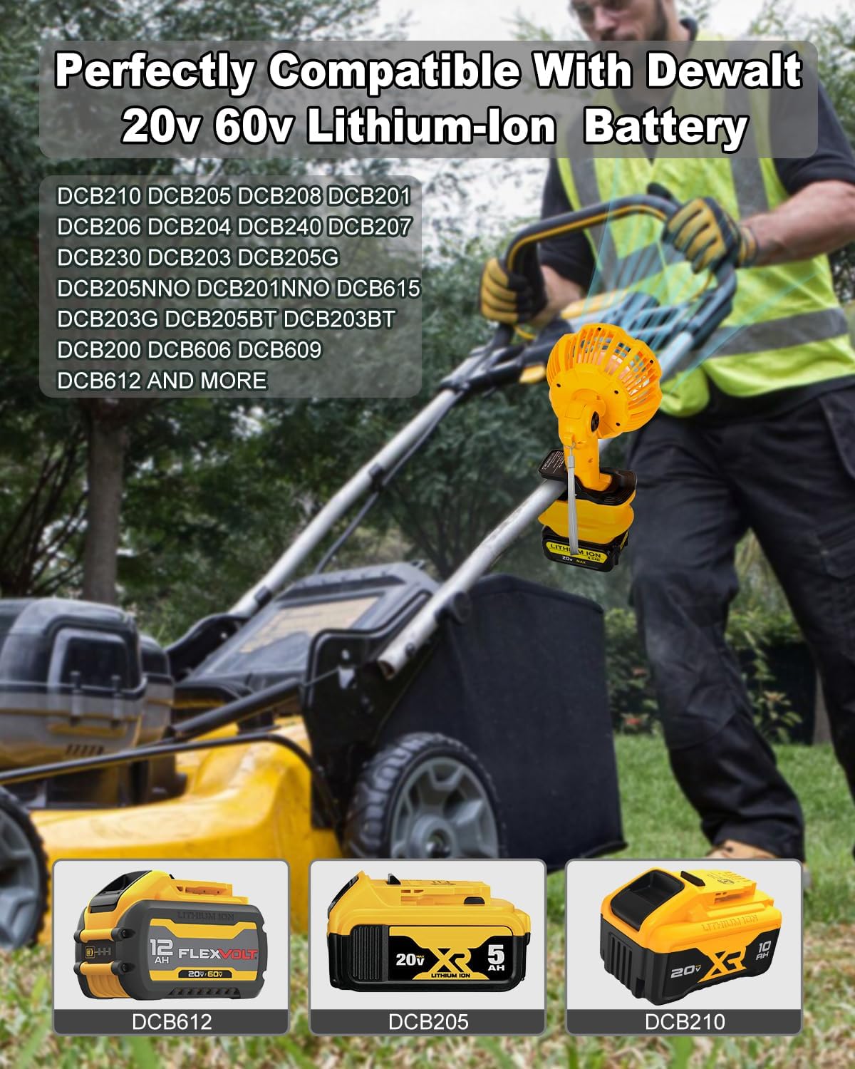 • ❆【20 V kabelloser Ventilator】- Dieser 16,5 cm grosse Akku-Lüfter (Klingendurchmesser 10,8 cm) ist perfekt kompatibel mit Dewalt 20 V/60 V Lithium-Ionen-Akkus. Wenn Sie DCB205 Batterie verwenden, kann dieser kleine Ventilator mindestens 15 Stunden