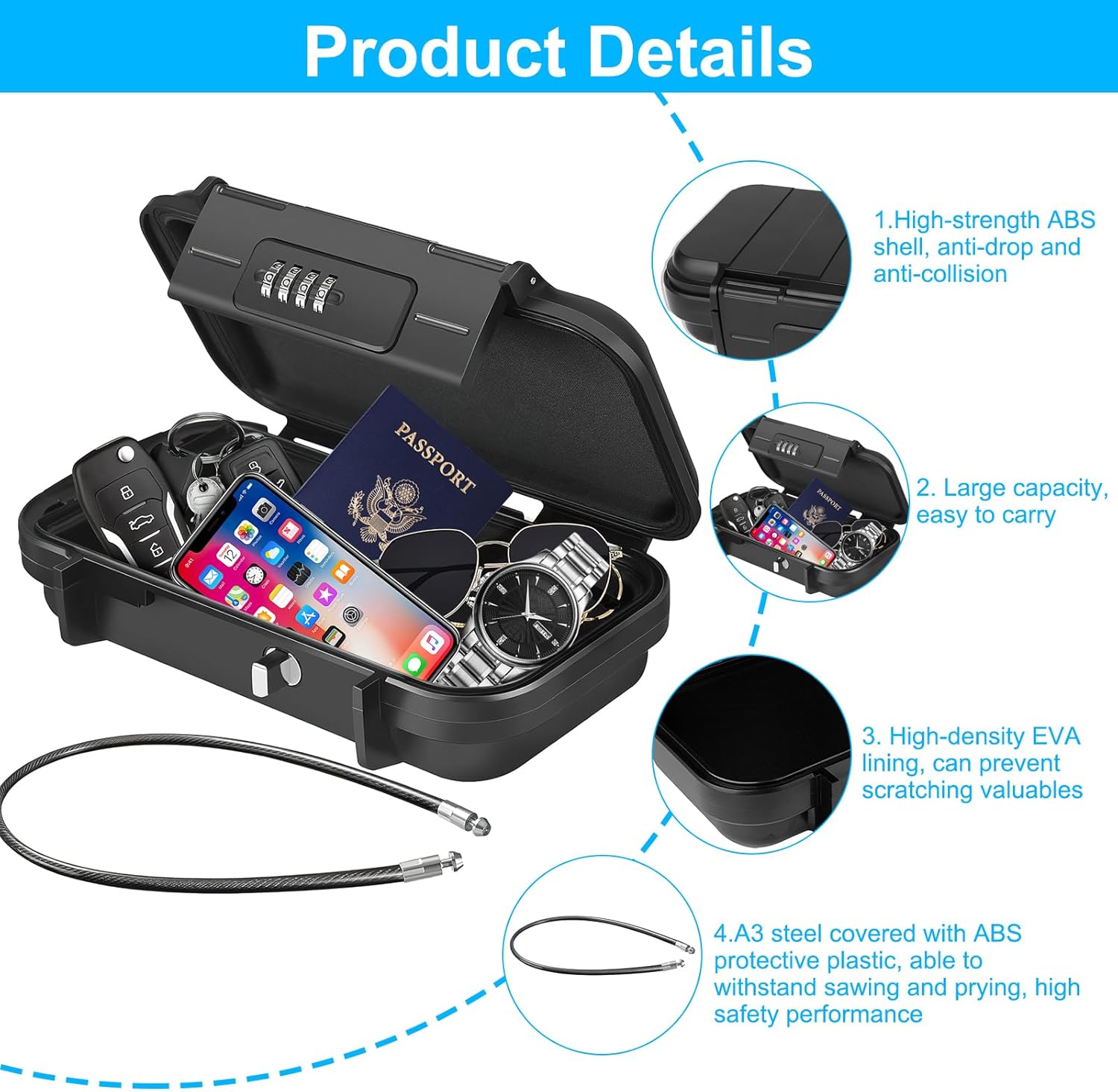 - GROSSE LAGERKAPAZITÄT: Dieser tragbare Safes hat einen grossen Stauraum, der sich zum Schutz von Smartphones, mobilen Geräten, Pässen, Bargeld, Kreditkarten, Uhren, Schmuck, wichtigen Dokumenten und so weiter eignet. Die Innenmasse des Tragbarer