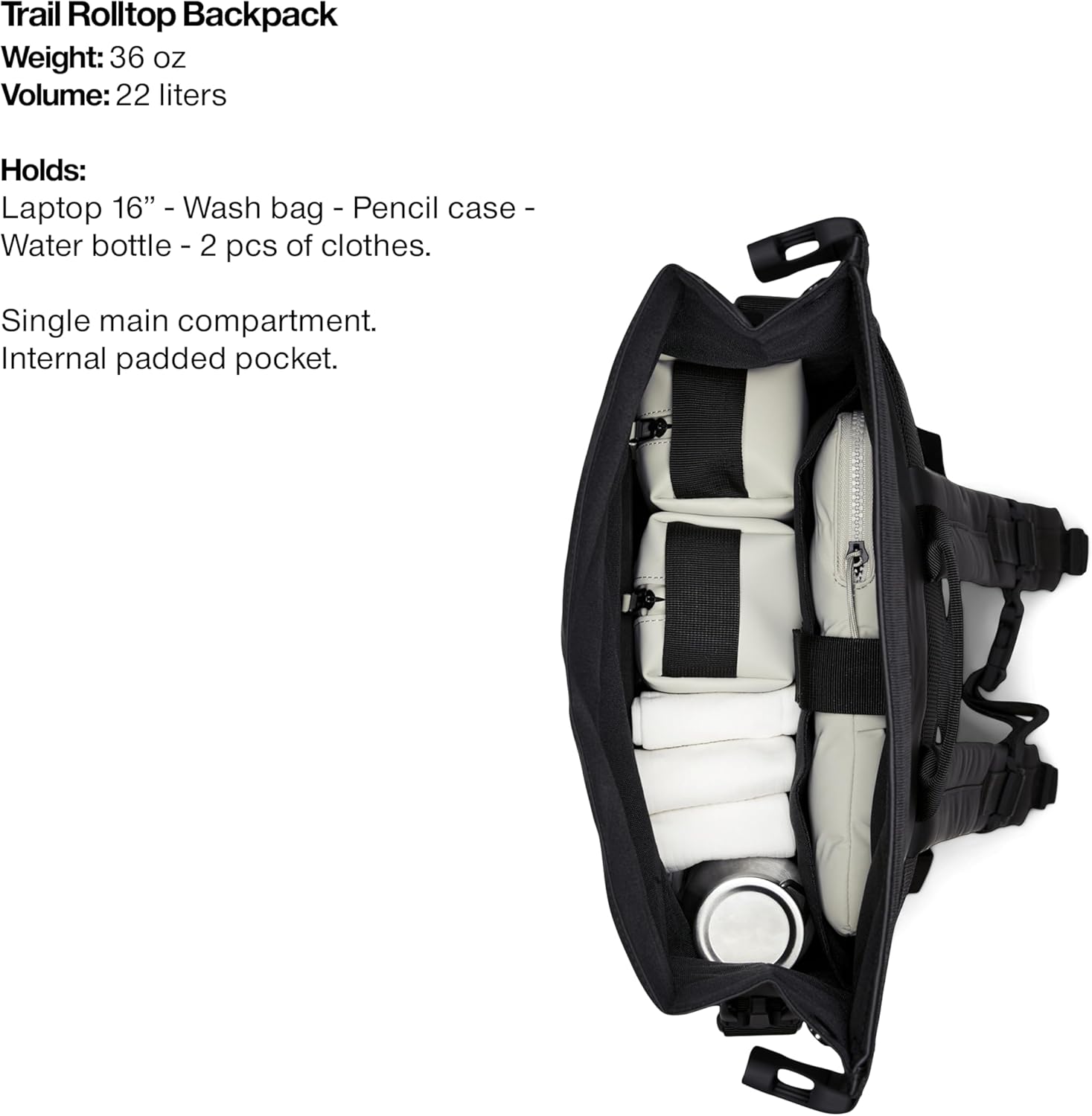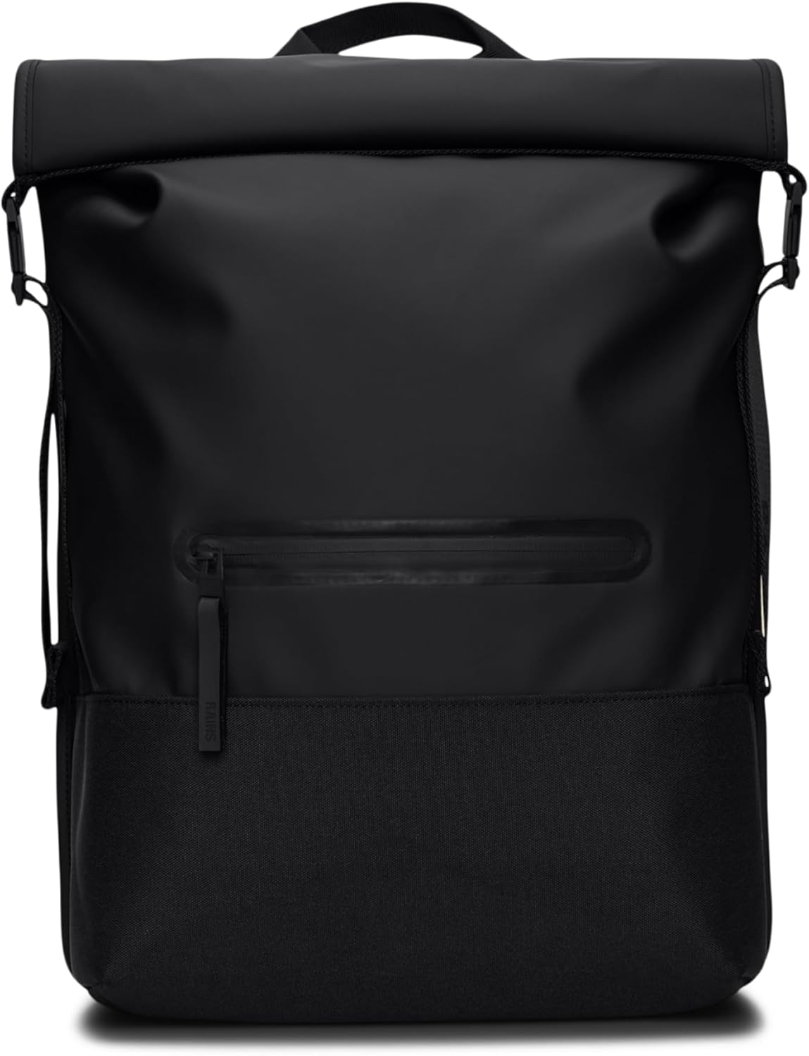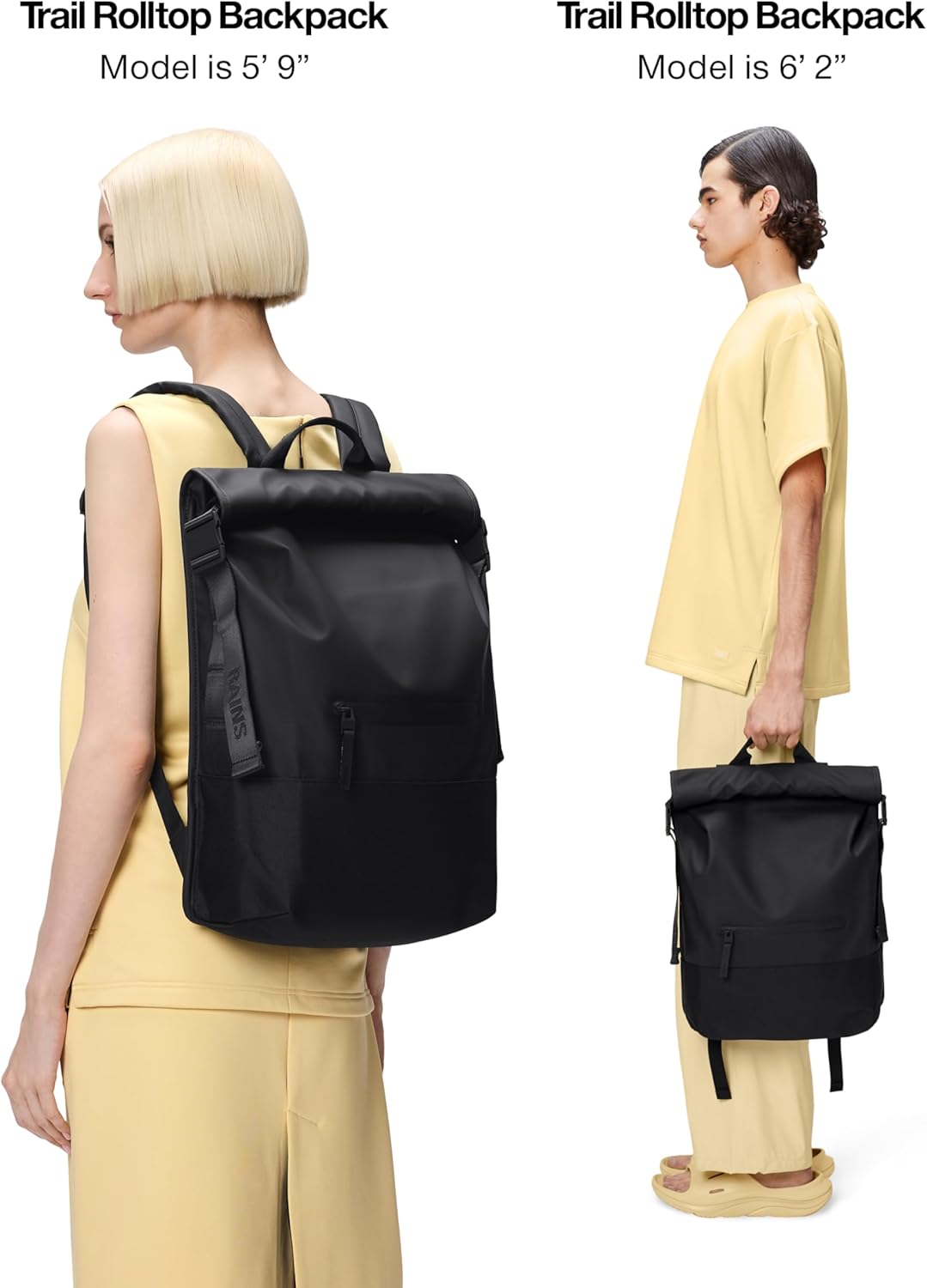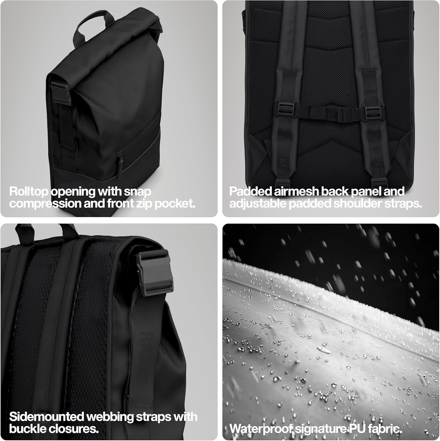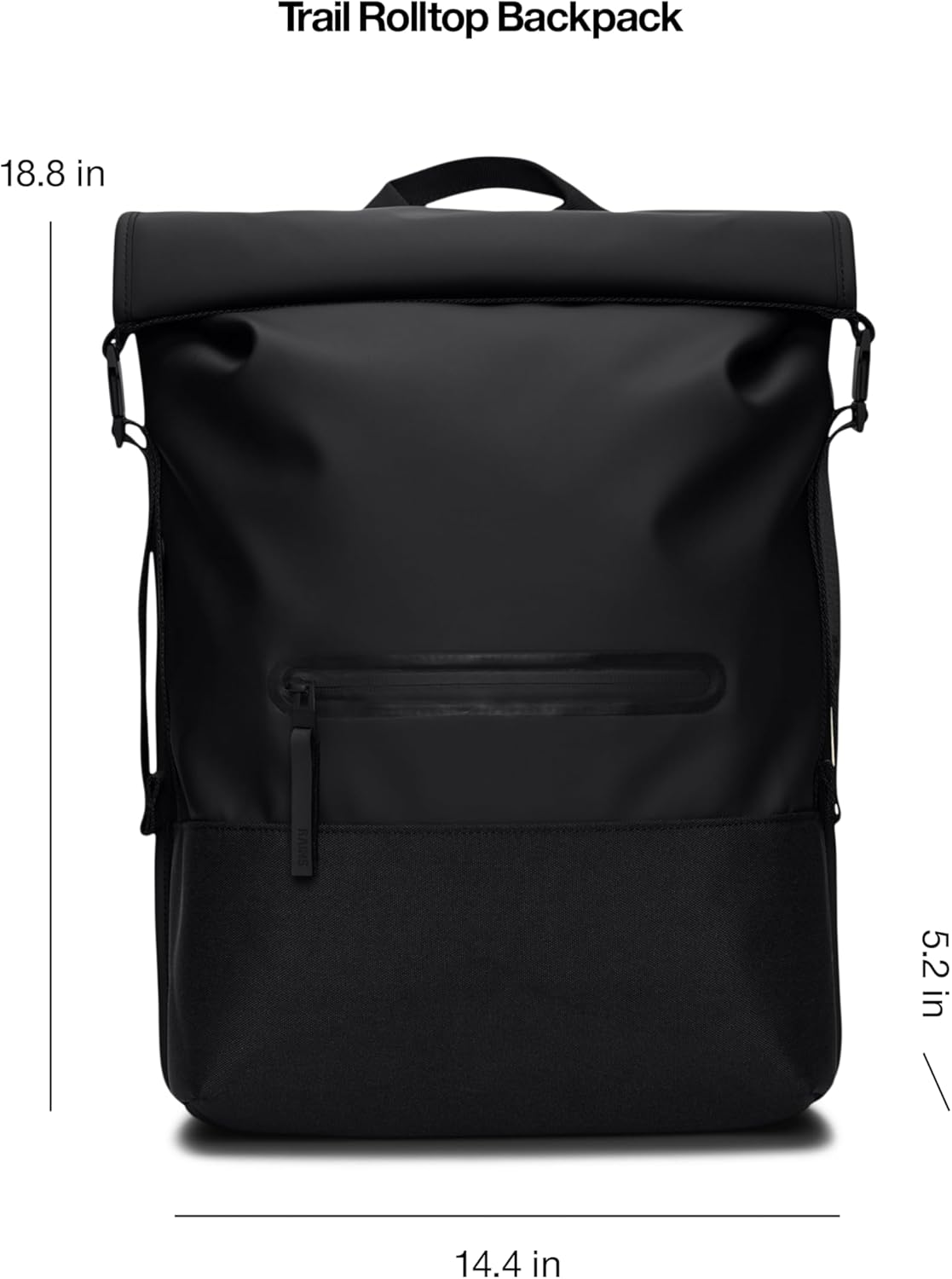 PRODUKTBESCHREIBUNGEN Trail Rolltop Rucksack ist ein Muss für die Stadt, perfekt für Pendler auf dem Fahrrad oder zu Fuss. Die Silhouette zeichnet sich durch seitlich angebrachte Signaturschnallen und eine Rolltopöffnung für einen sportlichen Gebrauchslook aus. Die wasserdichte Tasche verfügt ausserdem über eine interne gepolsterte Laptoptasche, eine Fronttasche mit Reissverschluss und ein gepolstertes Rückenteil. Das Design ist mit einem Brustgurt mit Schnalle für eine sichere und fahrsichere Passform versehen. Trail Rolltop Rucksack ist aus Rains' charakteristischem wasserdichtem PU-Gewebe geschnitten, entwickelt für Tragestärke, Haltbarkeit und ein glattes Gefühl.