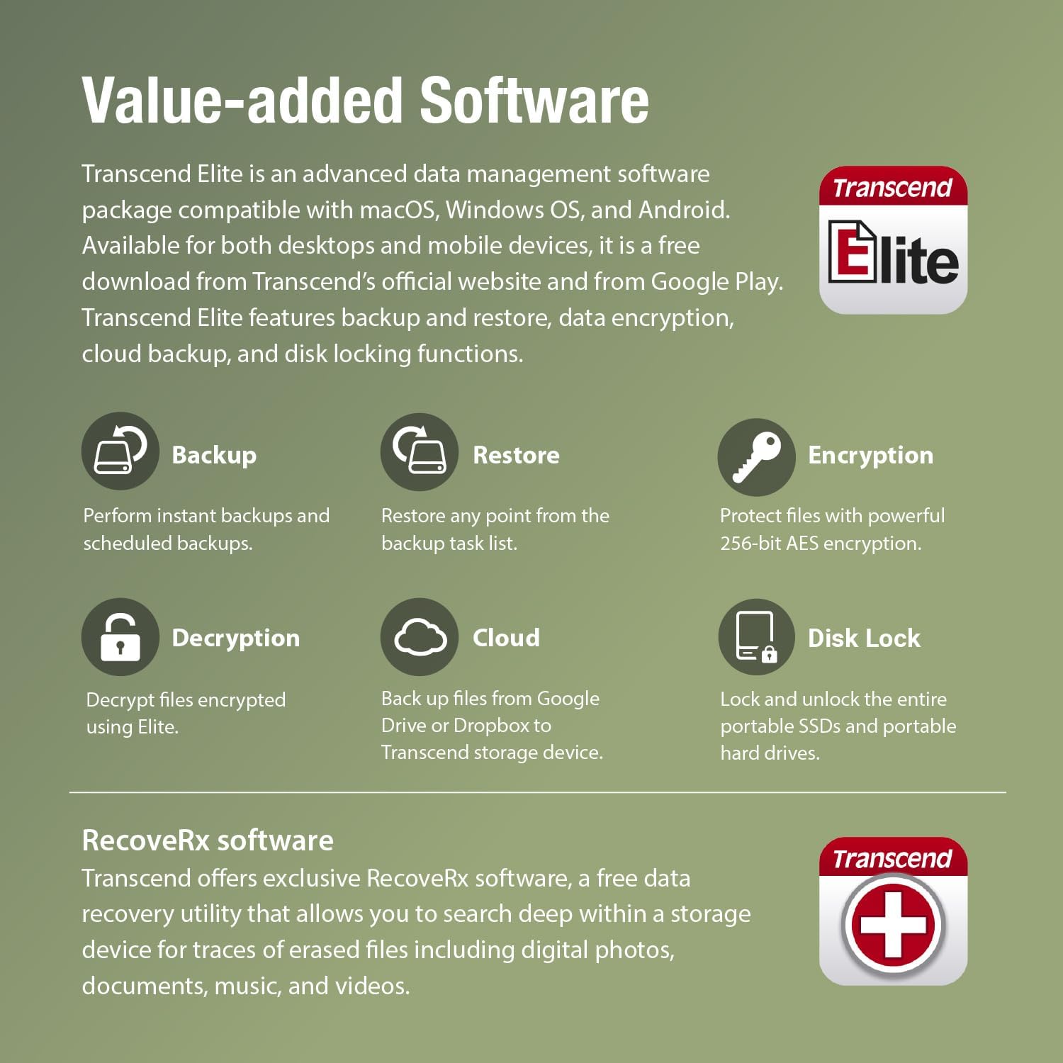 - Inklusive der Transcend Elite-Datenmanagement-Software und RecoveRx-Datenrettungssoftware