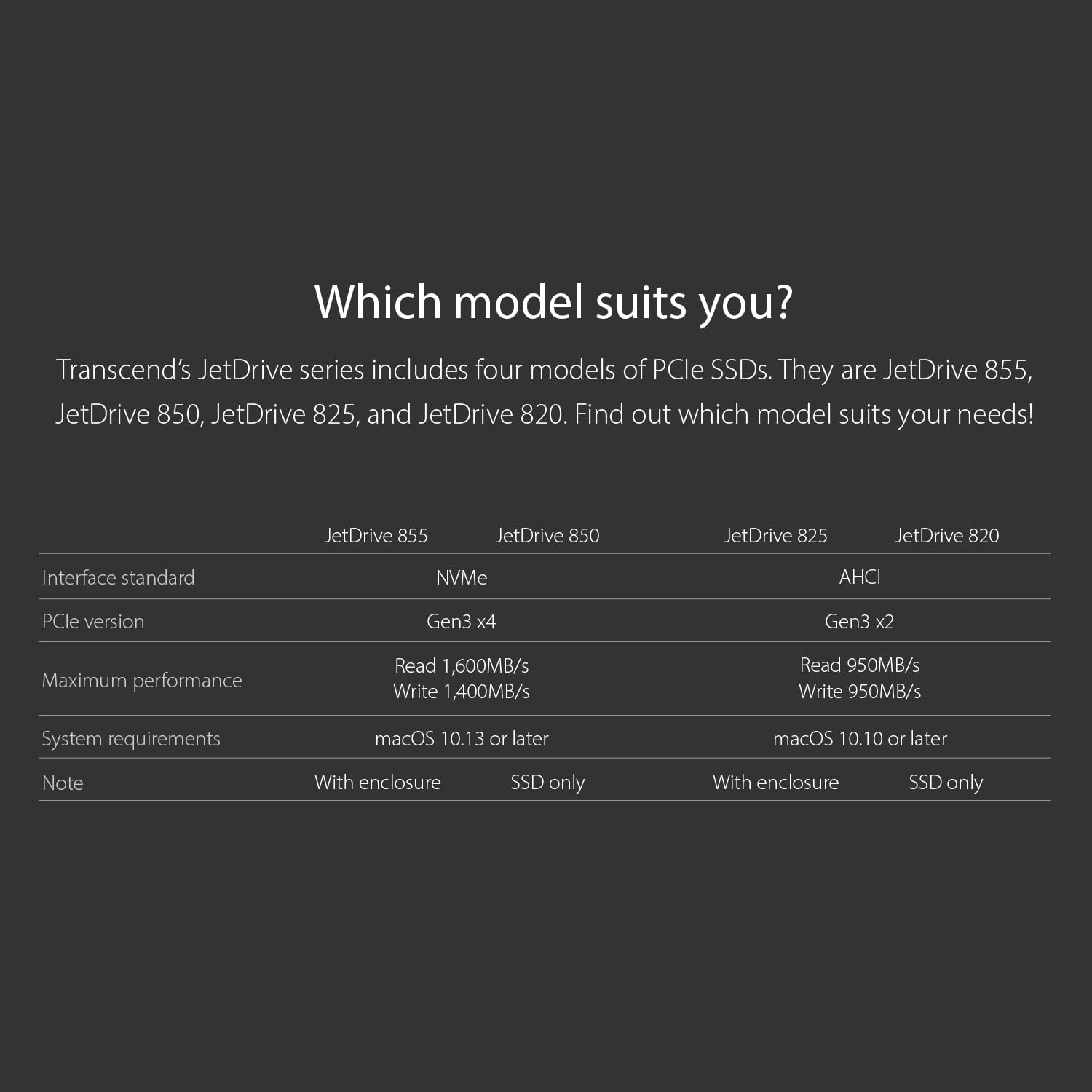 - JetDrive 855: Kombiniert JetDrive 850 mit einem Thunderbolt-Gehäuse (mit 10Gb/s Thunderbolt-Schnittstelle für blitzschnelle Dateiübertragungen). Betriebstemperatur: 0°C bis 60°C.