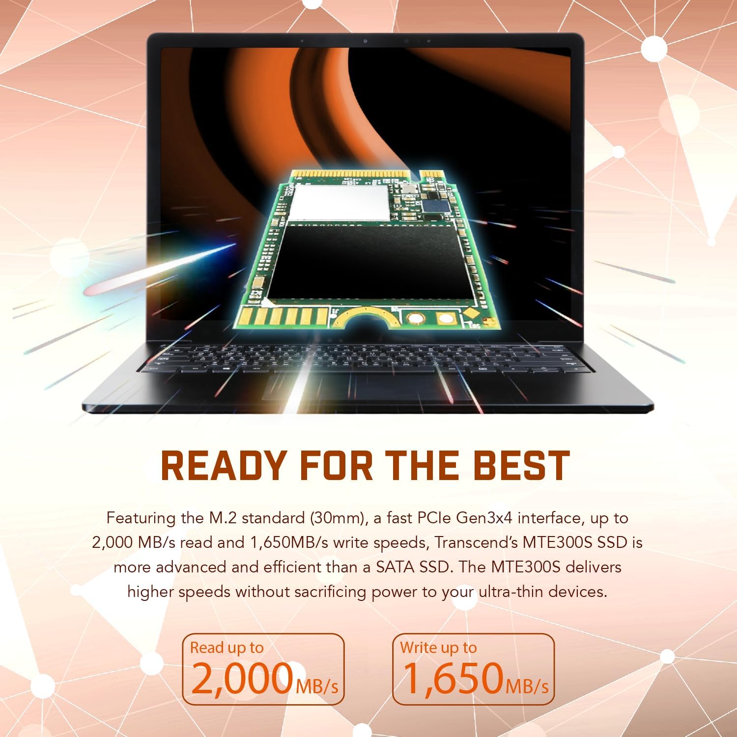 - Bereit für das Beste - Mit dem M.2-Standard (30 mm), einer schnellen PCIe Gen3x4-Schnittstelle, bis zu 2.000 MB/s Lese- und 1.100 MB/s Schreibgeschwindigkeiten ist Transcends MTE300S SSD fortschrittlicher und effizienter als eine SATA-SSD. Der MTE300S