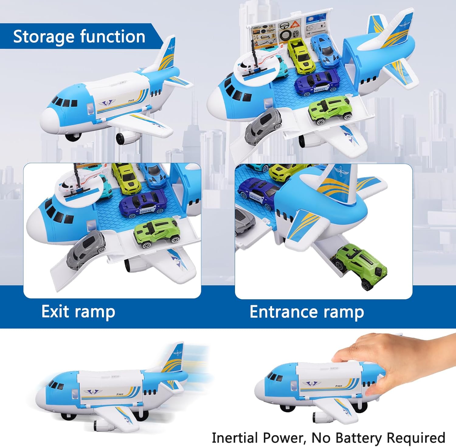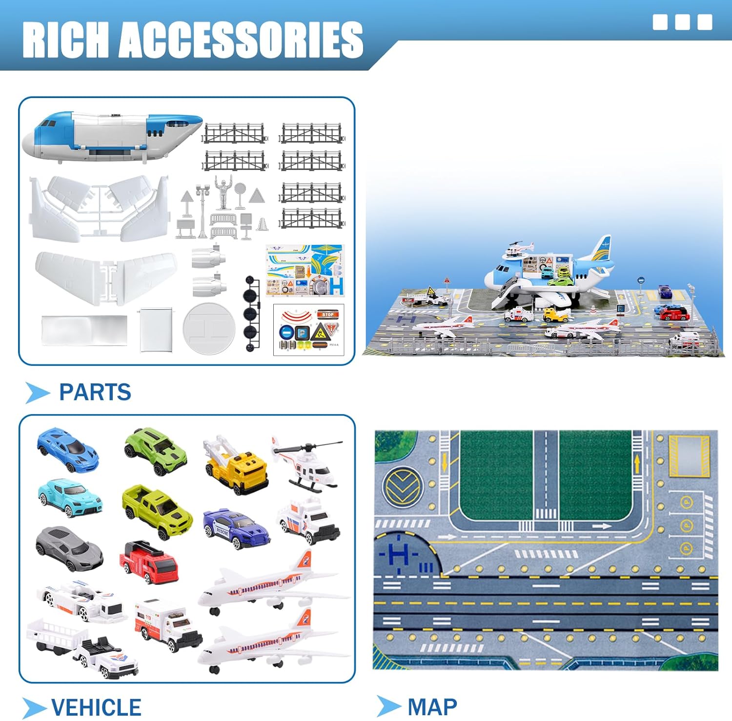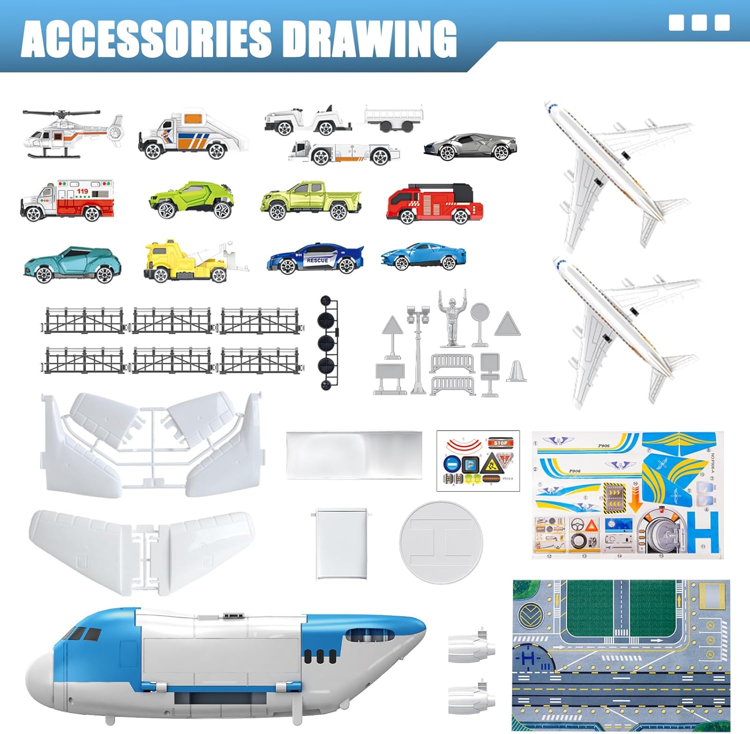 - Flugzeug-Spielset: Dieses Transportflugzeug-Modellset enthält 13 kleine Fahrzeuge (Flugzeuganhänger, Flugzeugaufzug, Gepäckwagen, Sportwagen, Polizeiauto, Krankenwagen, Feuerwehrauto usw.), zwei kleine Flugzeuge und ein grosses Flugzeug. Es wird mit