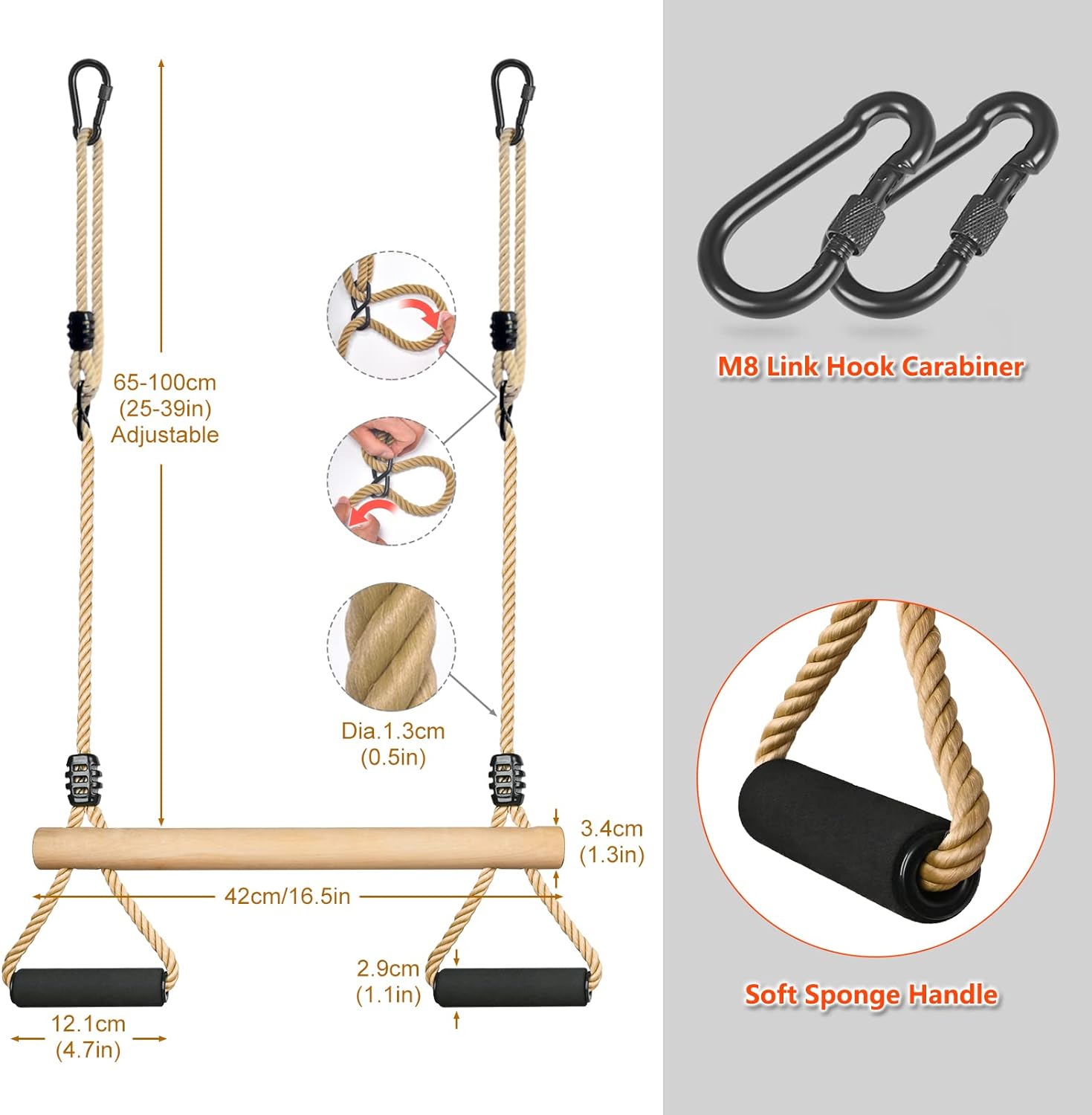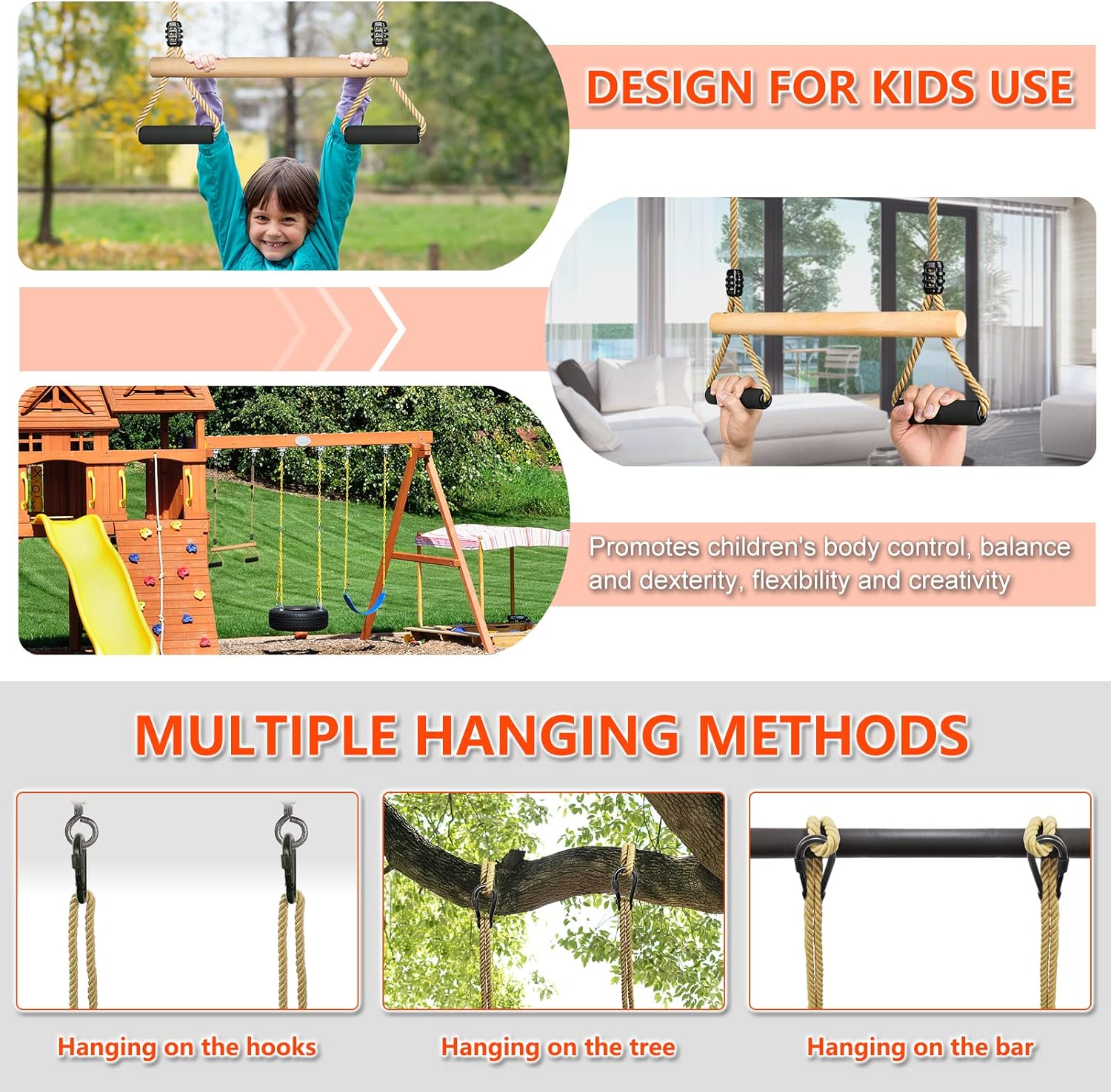- 【Schöne Trapez Schaukel】Der Hartholz der trapez schaukel besteht aus massives Kiefernholz. Die Länge der Holzstange beträgt 42 cm und der Durchmesser 3,4 cm, Design für Kinder über 3 Jahre, starkes Holz belastbar bis 100kg. Lyndwin schwingen mit Ringen anzug für innen und draussen.