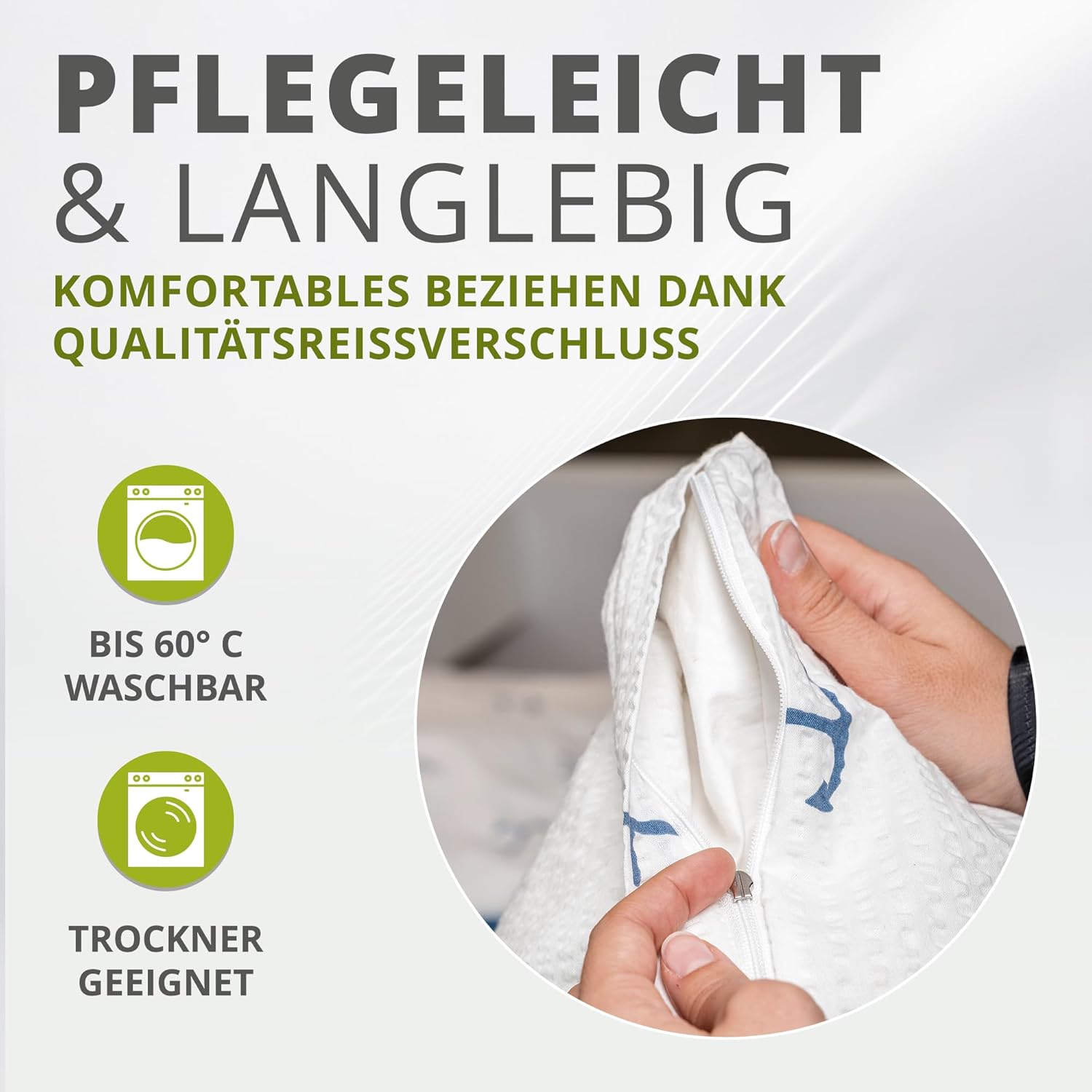 - ✅: Praktisch und pflegeleicht: Unsere Produkte sind hochwertig, langlebig und bieten mit einem Qualitätsreissverschluss bestmöglichen Komfort. Unsere Bezüge sind bei 60 Grad waschbar und absolut trocknergeeignet.