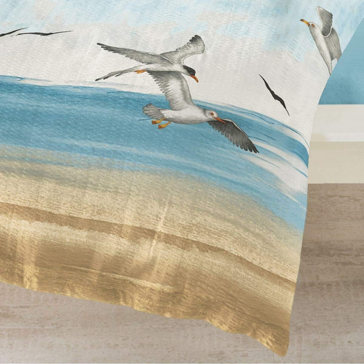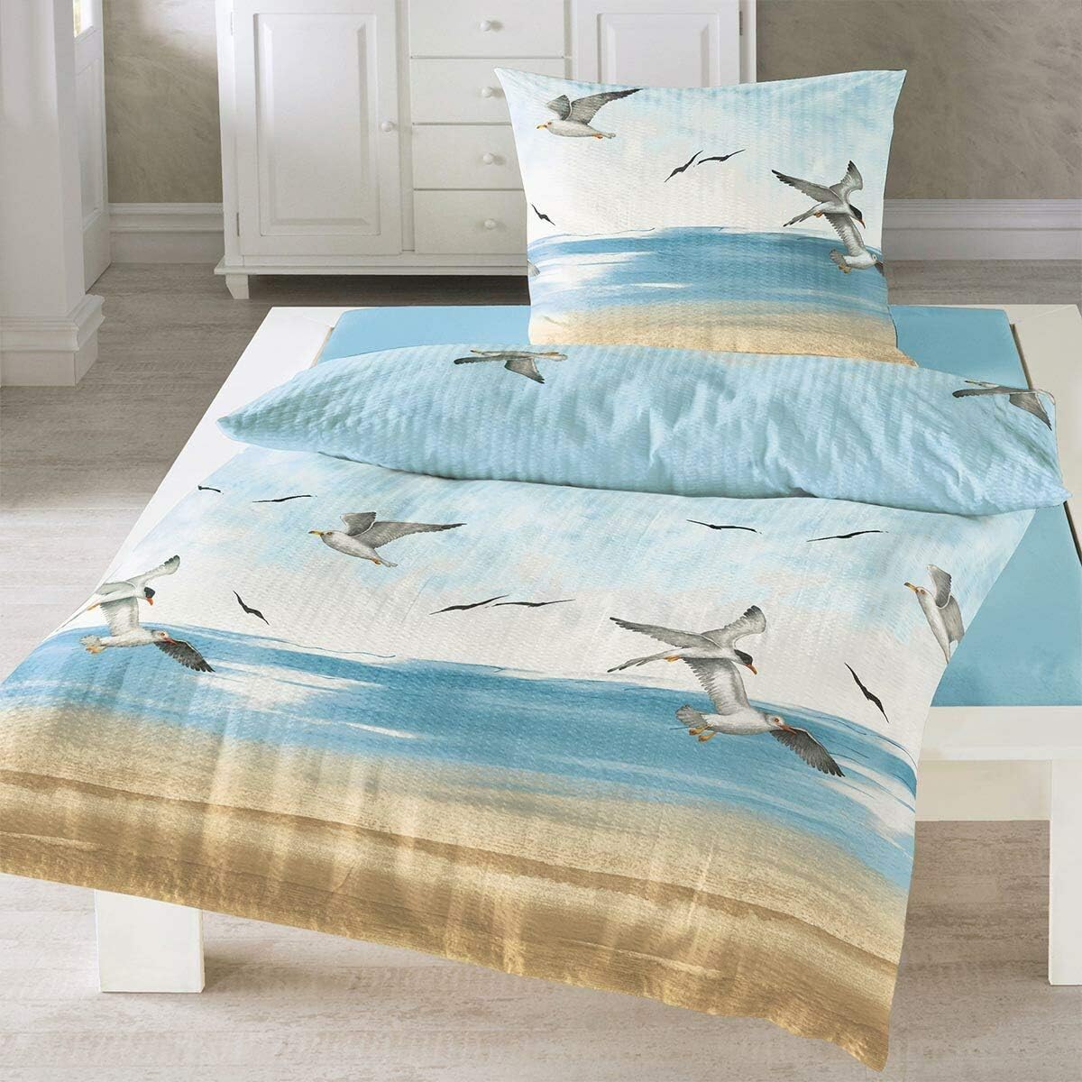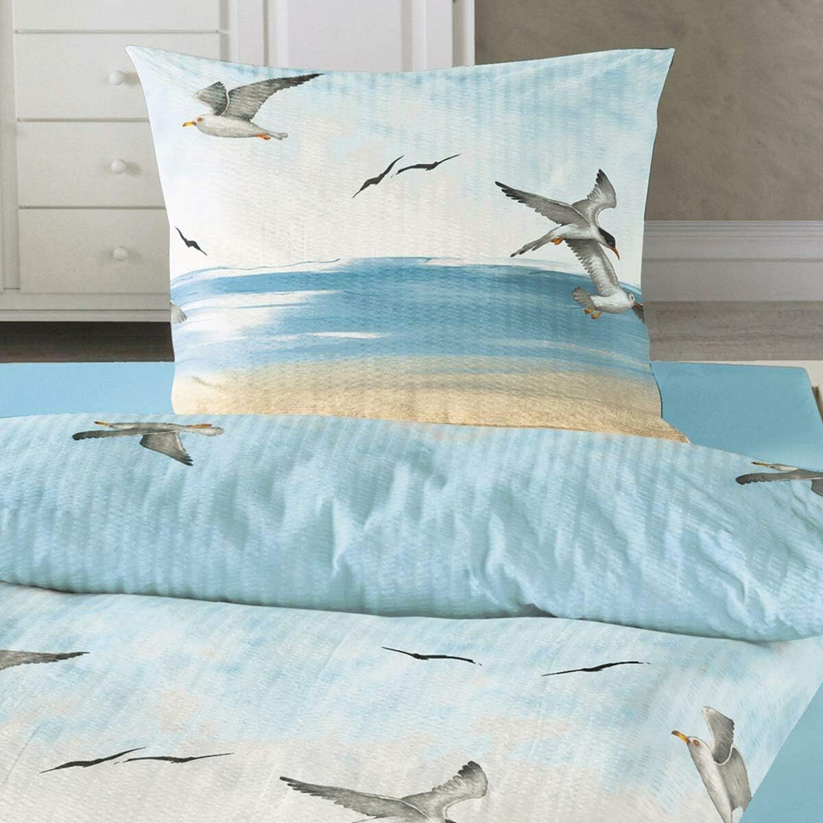 Traumschlaf Seersucker Bettwäsche Set •Bügelfrei• Maritimer Look Seemöven • mit Reissverschluss • 20