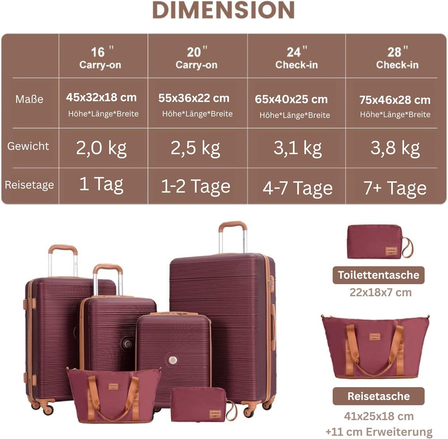 - 【EXKLUSIVES 6ER KOFFERSET】 Elegantes Travelhouse-Set mit 4 stilvollen Hartschalenkoffern, passender Reisetasche & Kulturbeutel – für jede Reise perfekt gerüstet.