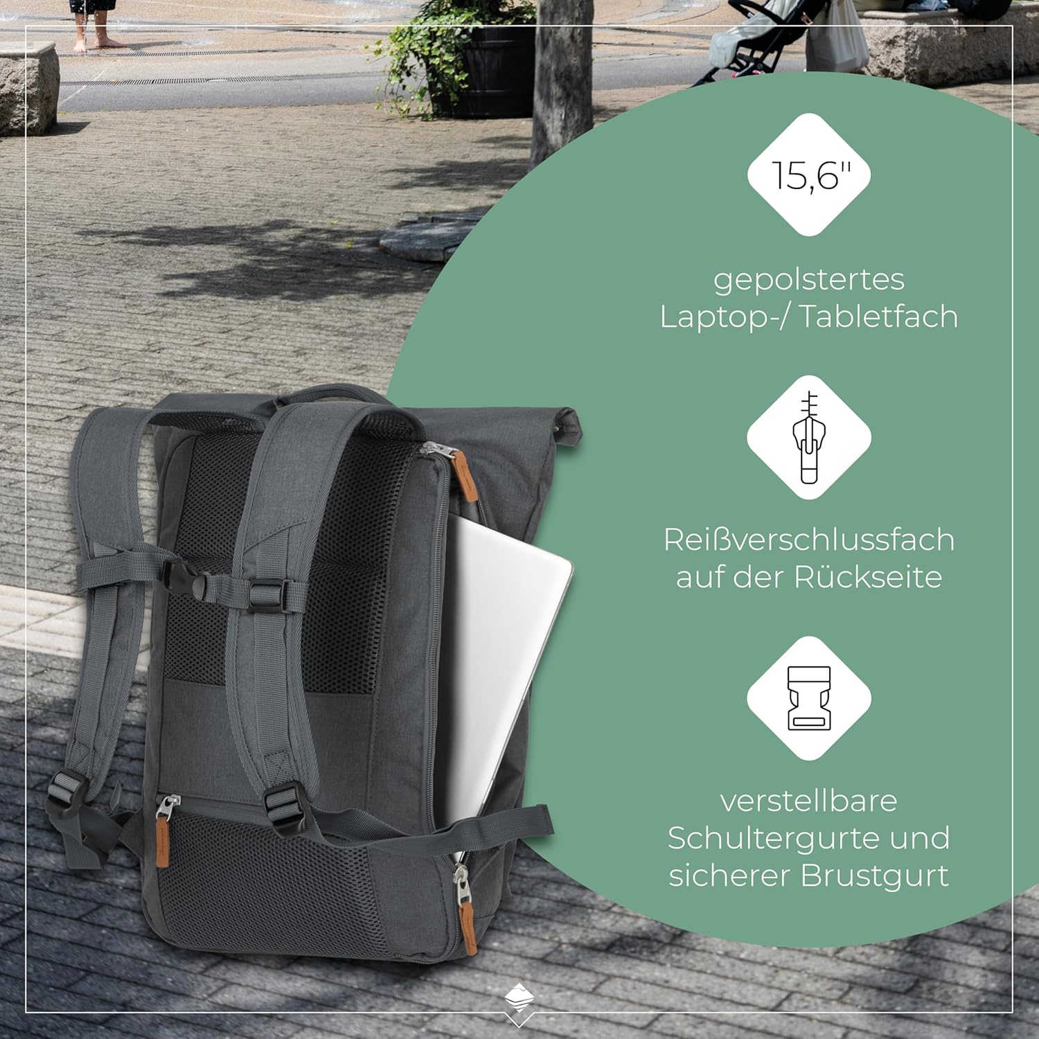 • AUSSTATTUNG: Der Rucksack bietet viel Stauraum mit einem gepolsterten Laptop Fach bis 15,6 Zoll mit seitlichem Einschub, einem grossen Hauptfach, zwei Vortaschen sowie einem kleinen Geheimfach auf der Rückseite