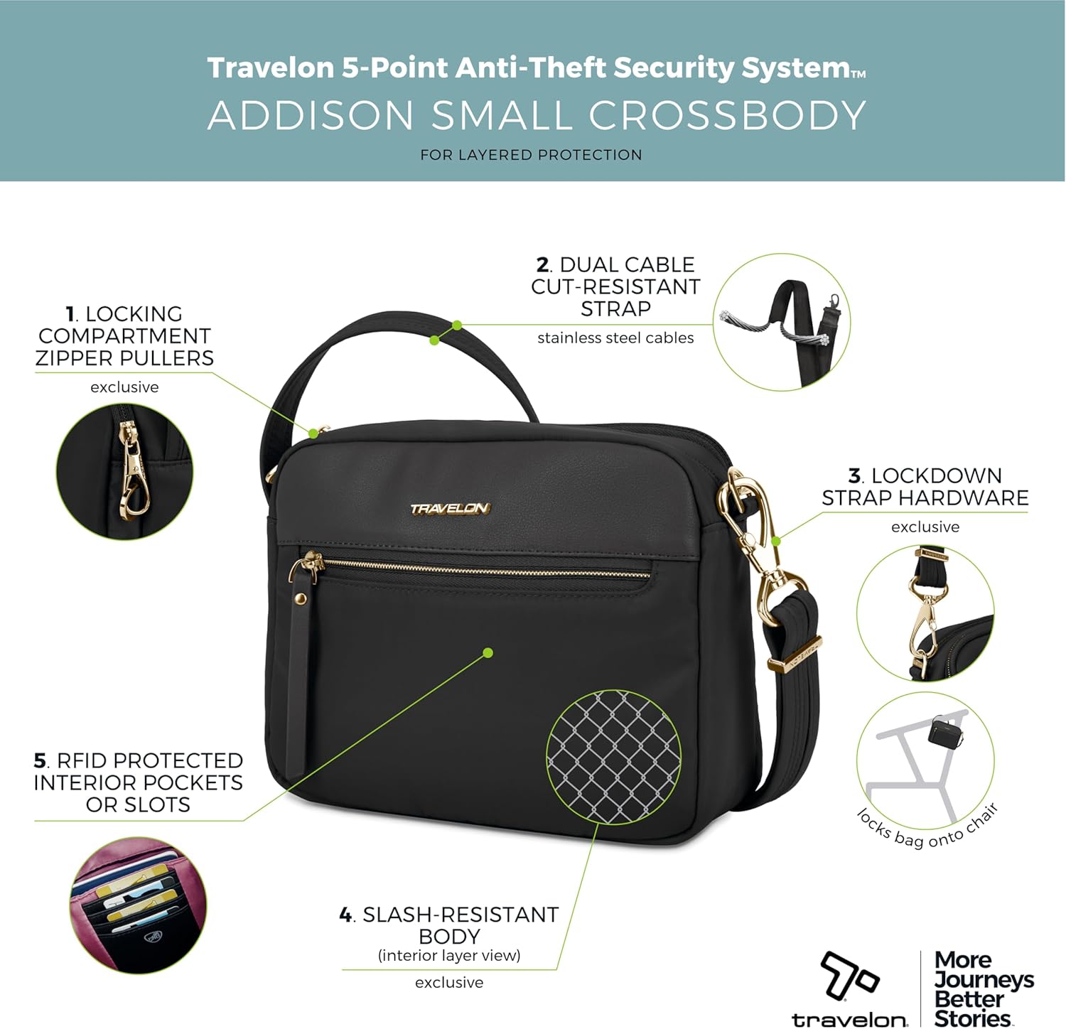 PRODUKTBESCHREIBUNGEN Entwickelt, um mit Ihrem Leben, Arbeit und Reisen Schritt zu halten. Der kleine Crossbody Addison verfügt über urbanen DNA und Reisepraktikabilität. Hochwertige Konstruktion und innovative Textilien aus robustem Nylon und Kunstleder. Durchdacht organisiert, um mit Ihrem Tag Schritt zu halten. Vertrauenswürdiges integriertes 5-Punkt-Diebstahlsicherungssystem, um Ihre Wertsachen vor Gelegenheitsdieben zu schützen. Addison von Travelon, wir tragen Ihre Welt.