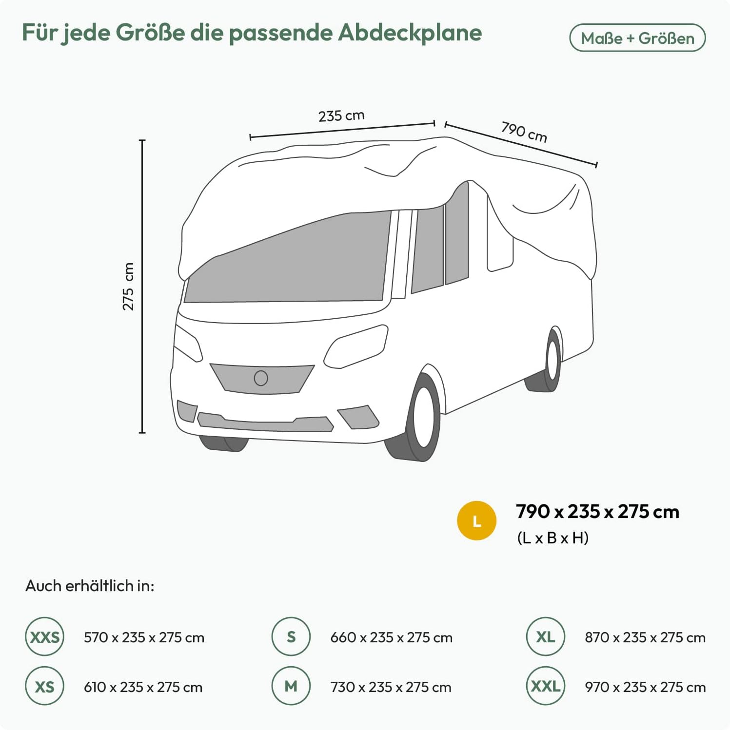 - VERSCHIEDENE GRÖSSEN: Die Wohnmobil Abdeckplane gibt es in sieben verschiedenen Grössen, so dass für jedes Wohnmobil die richtige Grösse dabei ist. Die Grösse L ist für Aufbauten bis ca. 790 x 235 x 275 cm ausgelegt.