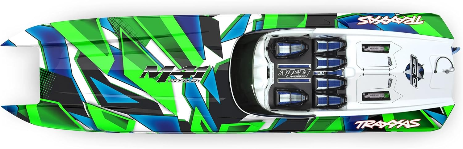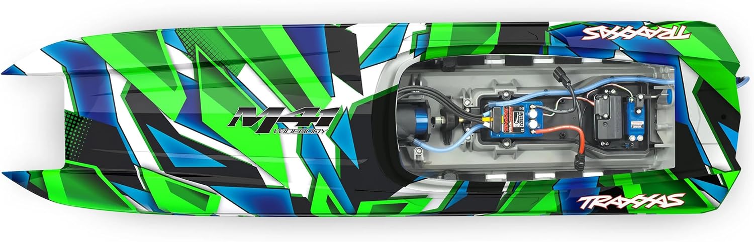 PRODUKTBESCHREIBUNGEN Der DCB M41 Widebody-Katamaran, der vom Gründer von DCB (Dave's Custom Boats), Dave Hemmingson, entworfen wurde, ist eines der grössten Modelle der DCB M-Serie. Mit seinem präzisionsgeformten Design und einem Paar Mercury Racing 1350 Motoren rast er mit 175 km/h über das Wasser! Traxxas hat das unglaubliche Aussehen und die Leistung der DCB M41 in einer detailgetreuen, massstabsgetreuen Nachbildung festgehalten, die vielseitig, unterhaltsam und schnell ist. Der Katamaran-Rumpf bietet die Geschwindigkeit, Stabilität und das Selbstvertrauen, für die die M41 in Originalgrösse berühmt ist, so dass Sie sich überall dort amüsieren können, wohin Sie Ihre Marineabenteuer führen. Der Nachbau der M41 fühlt sich gleichermassen wohl, wenn er bei einem Fun Run über die Wellen des Sees jagt oder seine Geschwindigkeit von über 50 Meilen pro Stunde auf einer bevorzugten Strecke auf glattem Wasser ausnutzt. Das rasiermesserscharfe Handling lässt Sie Kurven mit Autorität und Präzision carven und bietet dennoch eine einfache Kontrolle beim Fahren am Ufer. * Schnell! 50+mph auf 6S LiPo!* * 40" DCB M41 Widebody Katamaran-Nachbildung * Stabil! Doppelhüllen-Katamaran fährt über Wellen und glattes Wasser * Wassergekühlter, wasserdichter VXL-6s Marine-Geschwindigkeitsregler * 6S LiPo kompatibel mit eingebauter Niederspannungserkennung * Traxxas Hochstrom-Steckverbinder (patentiert) * Velineon 540XL bürstenloser Hochleistungsmotor mit Wasserkühlmantel mit hohem Durchfluss * Schnellauslösendes Power-Modul integriert Stromversorgungssystem mit wasserdichter Elektronik * Verstellbare Batteriefächer mit Klettverschlussriemen * Blau eloxierter Aluminium-Ruderträger, Ruder und Antriebsstrebe * Zierleisten aus Edelstahl und Hardware * TQi 2,4GHz-Funksystem und 5-Kanal-Empfänger * Zugriff auf die Traxxas Link-App mit dem Traxxas Link Wireless-Modul (#6511) (separat erhältlich) * Traxxas Stability Management