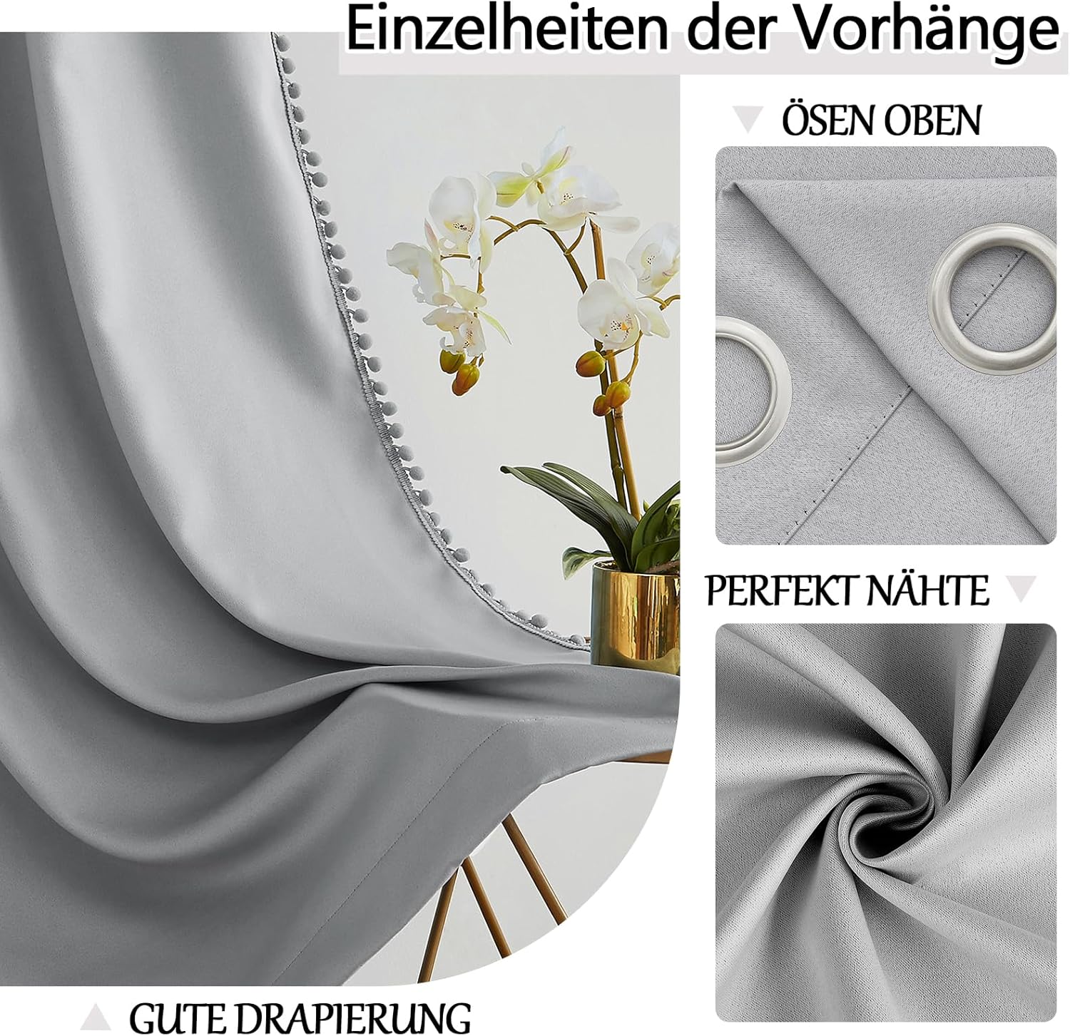 - PREMIUM-VORHÄNGE AUS GRAU: Jedes Paket enthält 2 Paneele Ösen Pompons Verdunkelungsvorhänge – 140 B x 180 cm H/Paneel, 280 B x 180 cm H/Paar. Es wird empfohlen, die 1,5- bis 2-fache Stangenbreite zu bestellen, um das richtige Aussehen und die