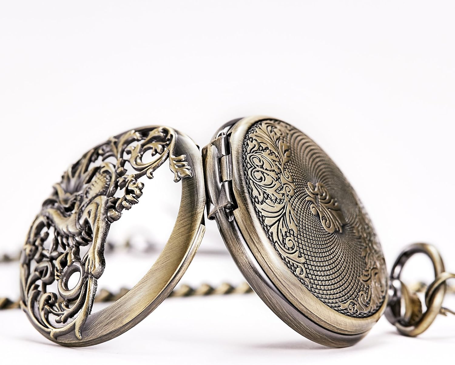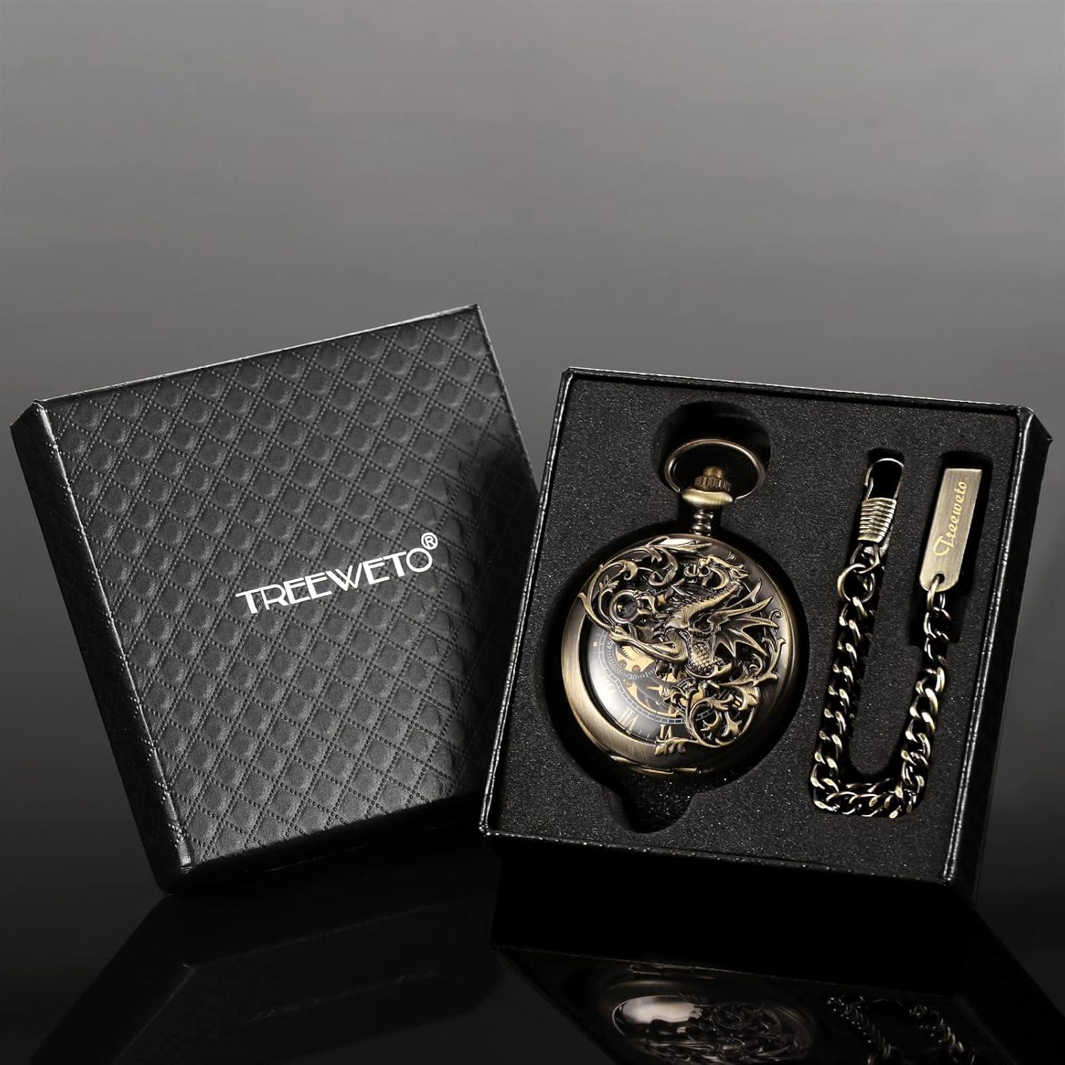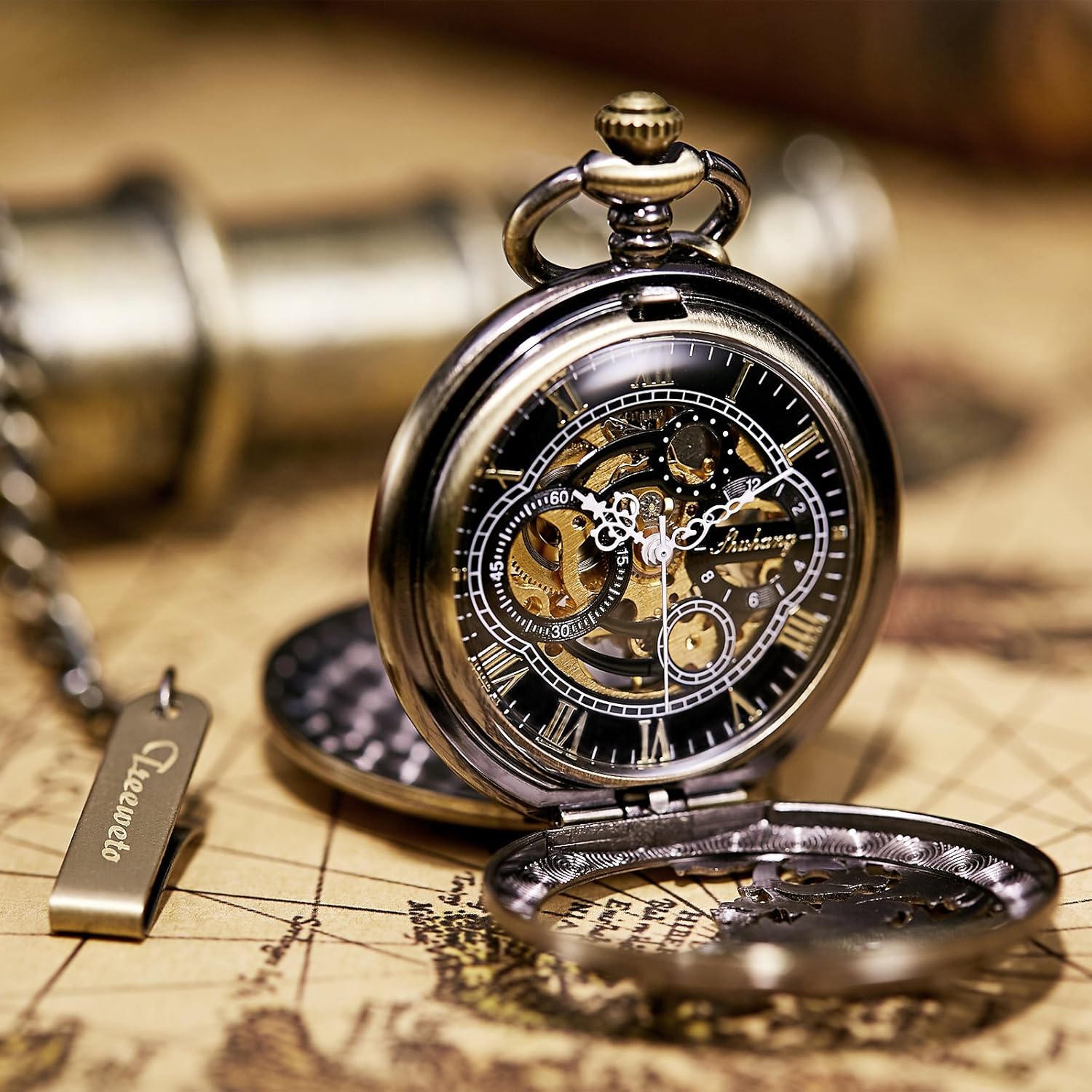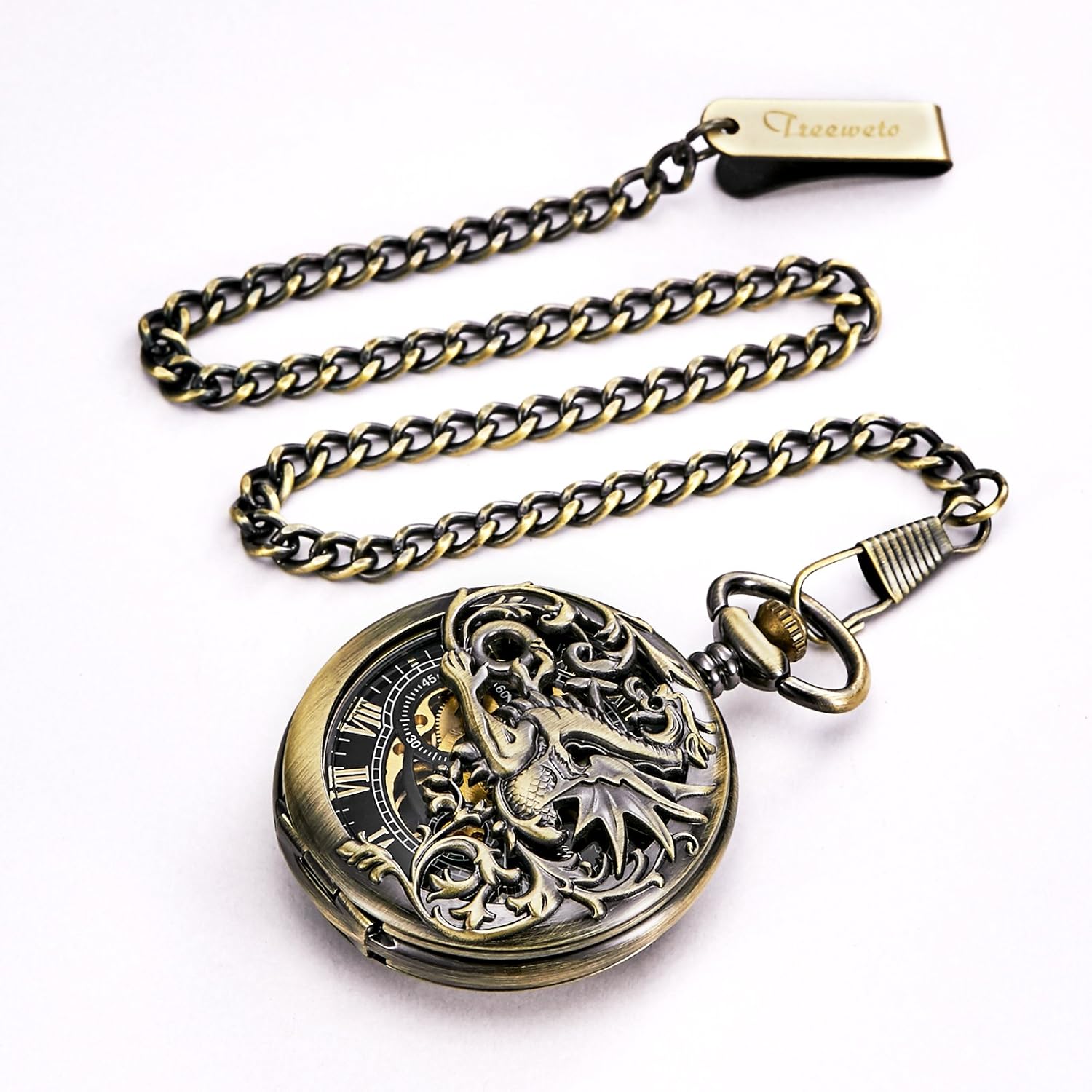 PRODUKTBESCHREIBUNGEN Spezifikationen: Gehäusematerial: Legierung. Gehäusedurchmesser: 48 mm. Kettenlänge: 38 mm (Haken im Lieferumfang enthalten). Gehäusedicke: 12 mm. Anwendungshinweise für mechanische Taschenuhr: Wenn Sie die mechanische Uhr erhalten: A Zeit einstellen Ziehen Sie die Krone von der Uhr weg und drehen Sie die Krone im Uhrzeigersinn, bis Sie die genaue Zeit erreicht haben. B. Aufziehen der Uhr. Drücken Sie die Krone zurück an die Basis der Uhr und ziehen Sie die Uhr auf. Rechtslauf mit 30-40 Umdrehungen. Die Leistung wird voll sein (zu viel Aufzug wird letztendlich die Feder brechen). Machen Sie dies einmal täglich (vor dem Schlafen). Andernfalls wird es nicht mehr funktionieren. Bitte nicht übermässig aufziehen, wenn Sie das Gefühl haben, dass die Krone fest ist. Lieferumfang: 1 x Taschenuhr. 1 x Geschenkbox. 1 x Kette.