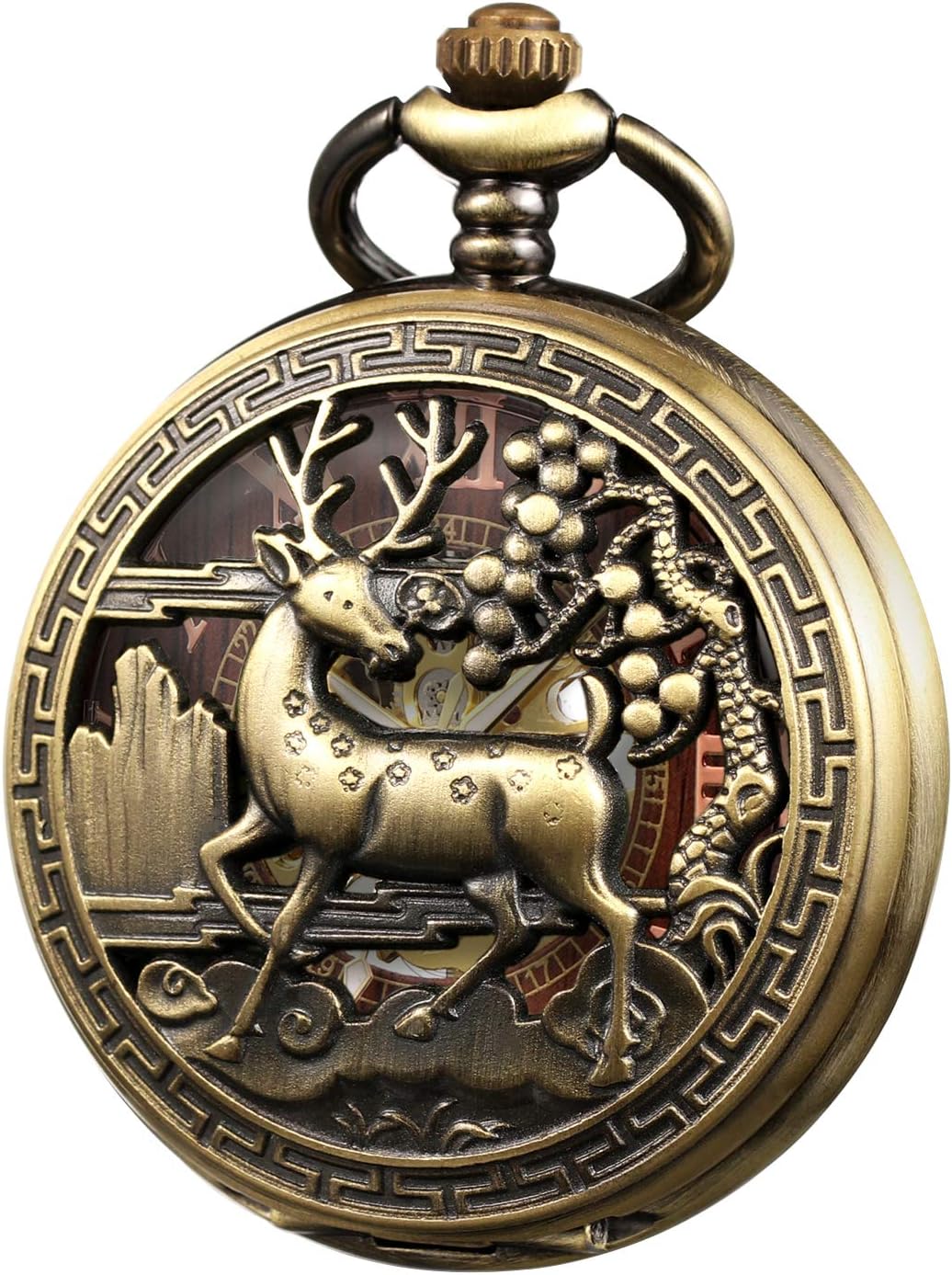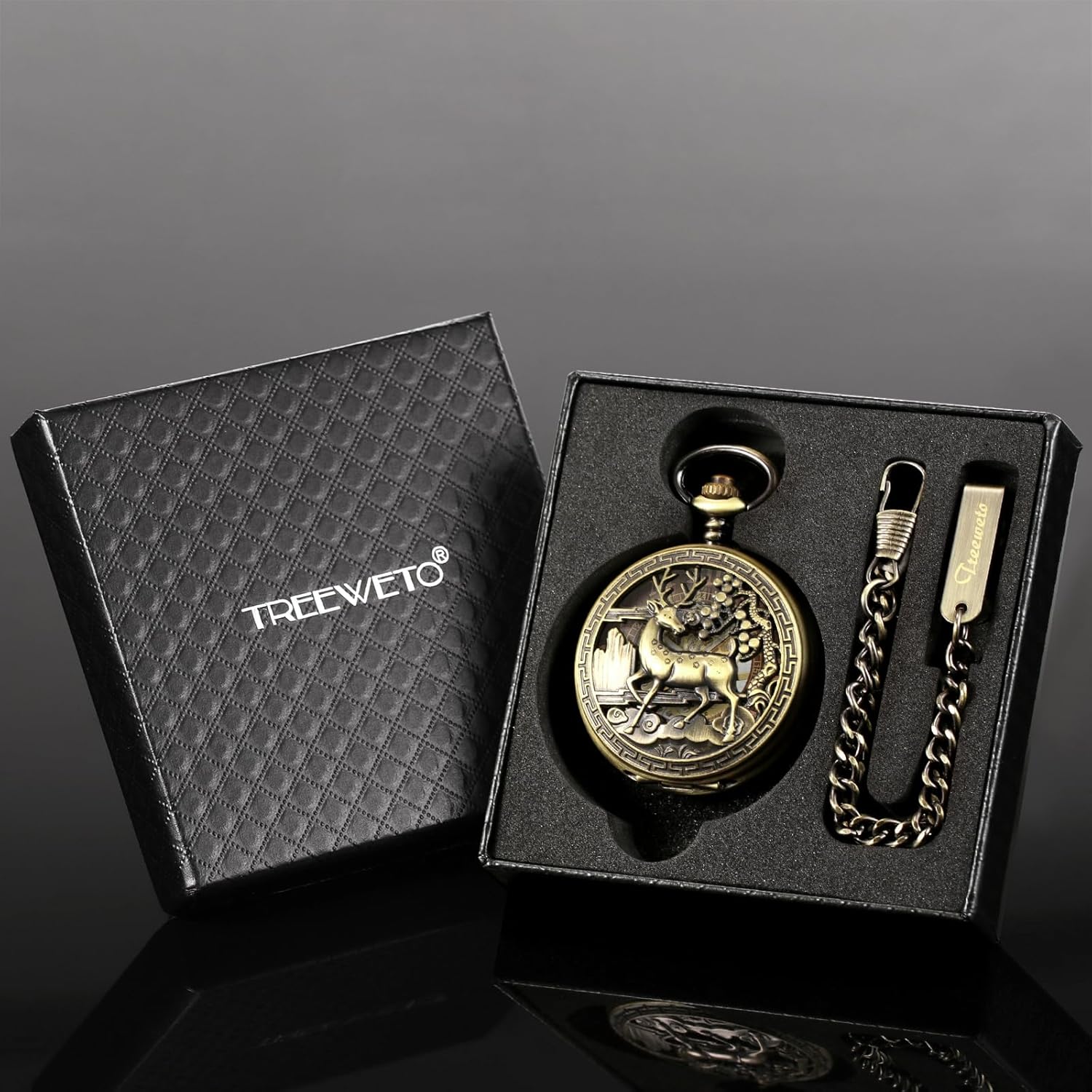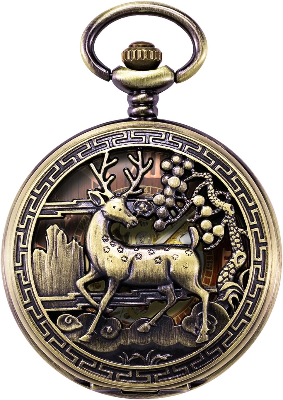 TREEWETO Unisex Taschenuhr Mechanisch Doppelter Abdeckung Rentier Hirsch Leuchtend Skelett Steampunk