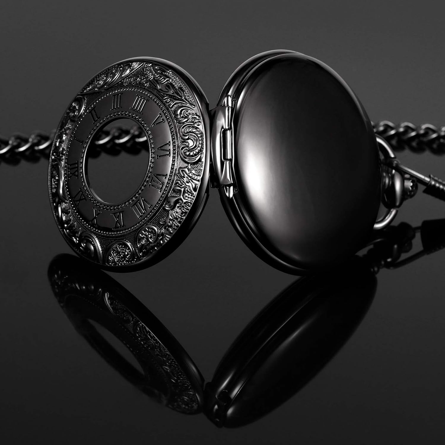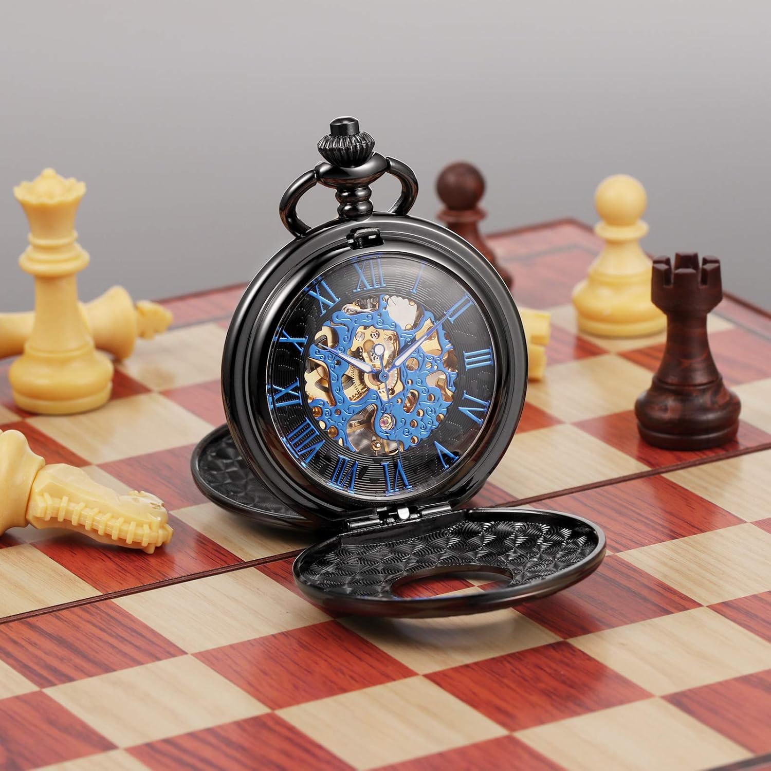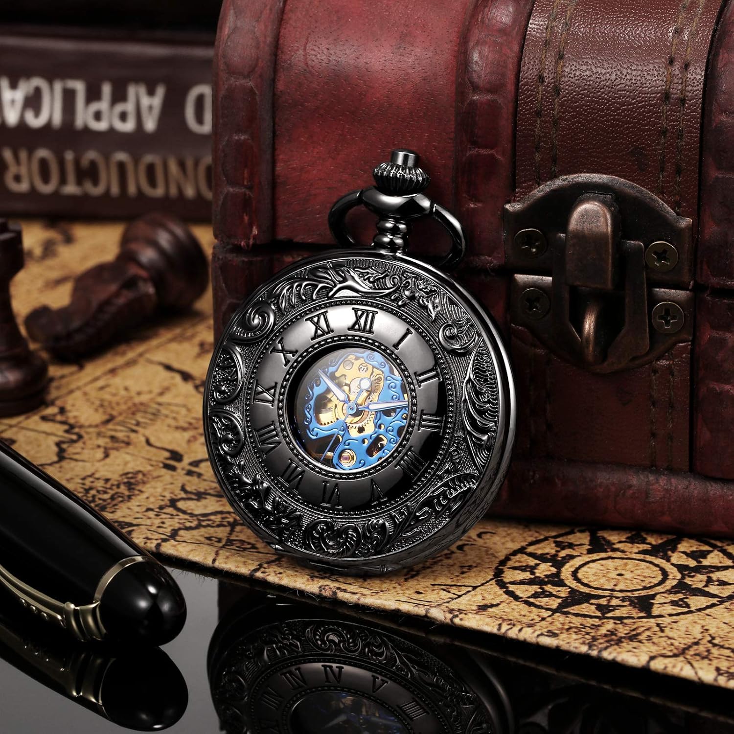 TREEWETO Unisex Taschenuhr mit Kette Mechanische Handaufzug Doppelscharnier Antik Skelett Römische Z