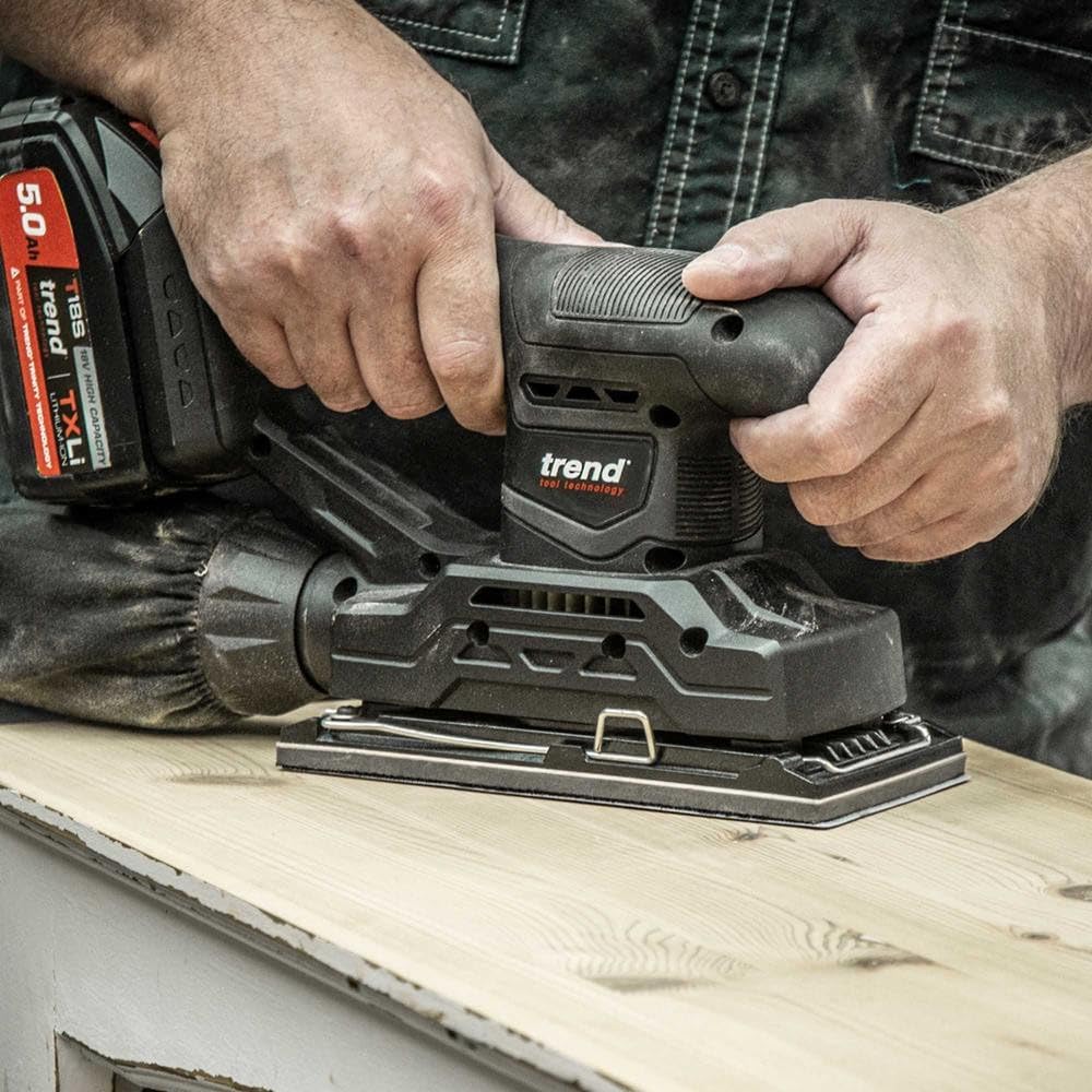 - KABELLOSES ARBEITEN: Der Trend T18S ist ein 18V kabelloser Drittelplatten-Schleifer, der ohne Akku und Ladegerät betrieben wird. Diese sind separat erhältlich und ermöglichen eine flexible Nutzung des Gerätes.