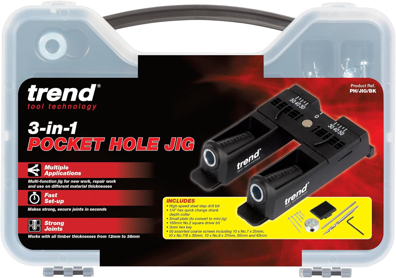 - VIELSEITIGE ANWENDUNG: Das Trend 3-in-1 Pocket Hole Jig Kit ermöglicht schnelles und präzises Bohren von Doppel- oder Einzeltaschenlöchern in Massivholz oder Plattenmaterialien.