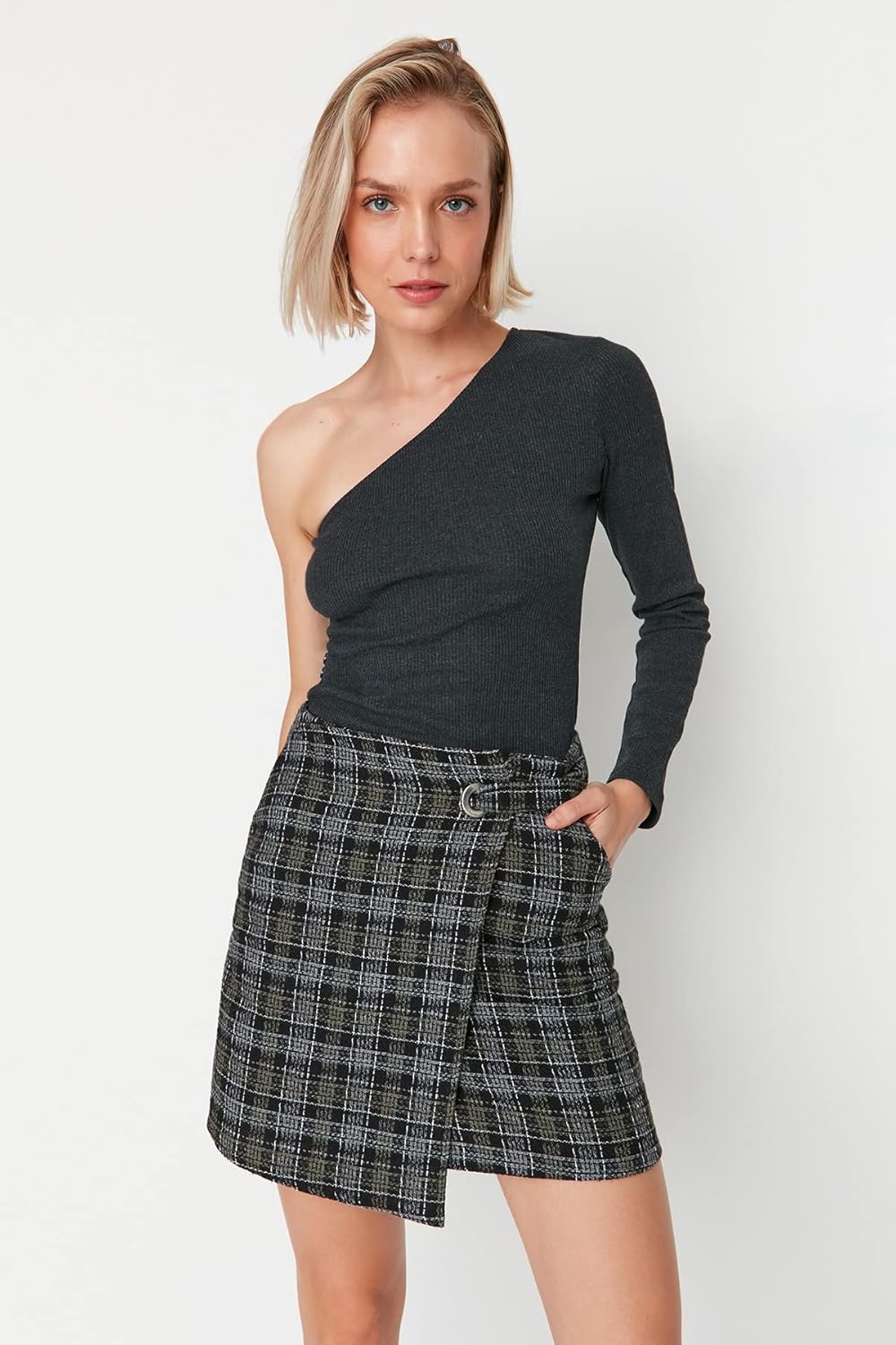 TRENDYOL Frau Mini Wickelschnitt Straight Webstoff Rock 38 Khaki, 38 Khaki