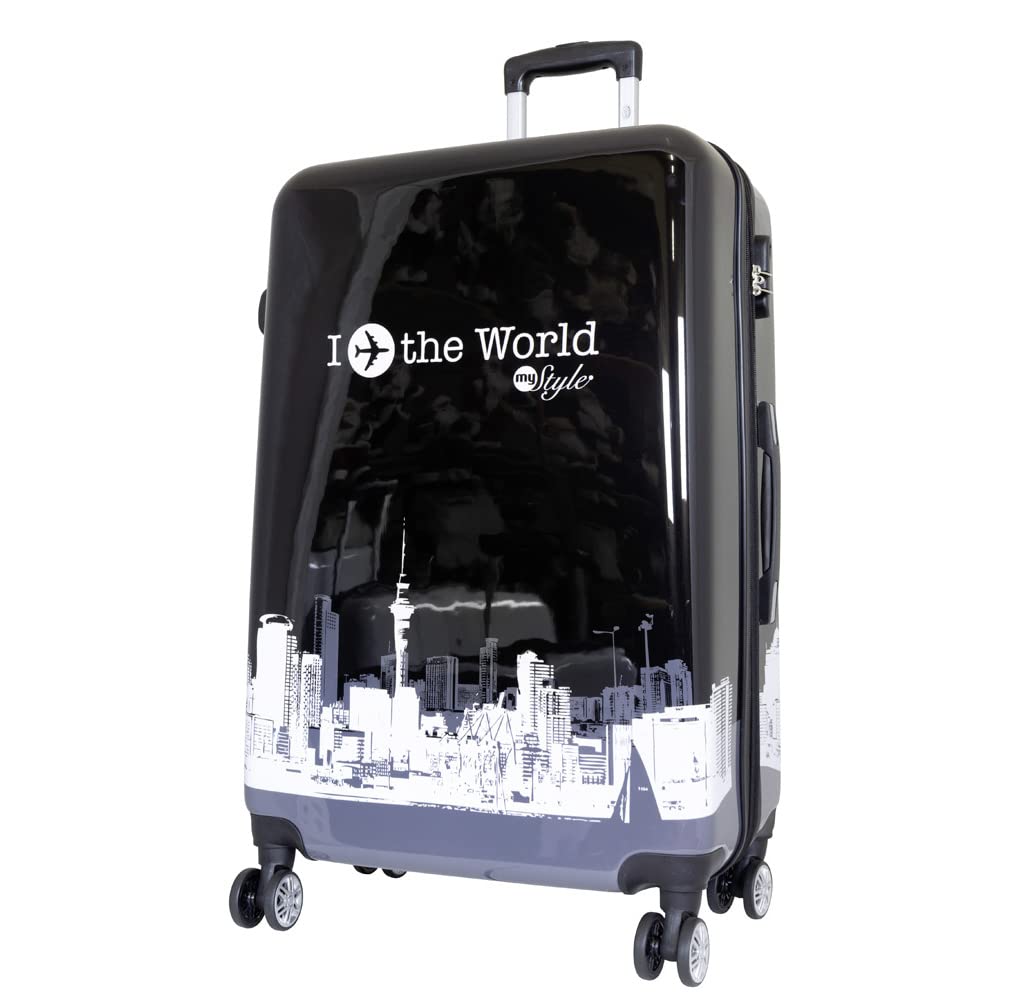 - ein grosser Reise-Koffer mit 4 Räderein grosser Reise-Koffer mit 4 Rädern, ideal geeignet für den Jahresurlaub oder längere Reisen über 2-3 Wochen. Bedruckt im modernen schwarz-weiss Design mit der Silhouette einer Stadt, einem Flugzeug und dem