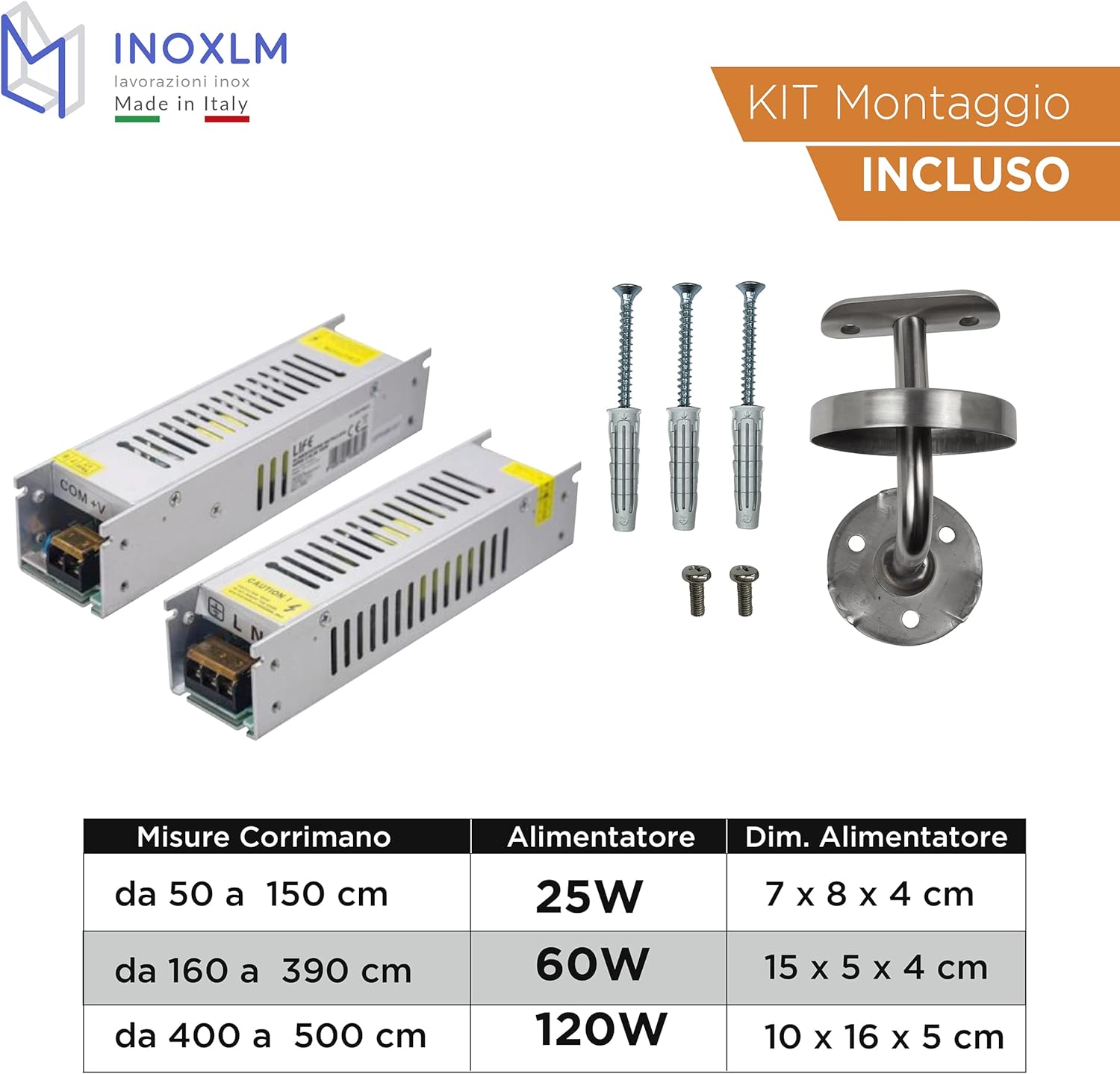 - ✅ Für die Handläufe mit LED, LED und Trafo sind im Lieferumfang enthalten. LED 14/W pro Meter, 24 V. Die Abmessungen des Transformators variieren je nach Länge des Handlaufs