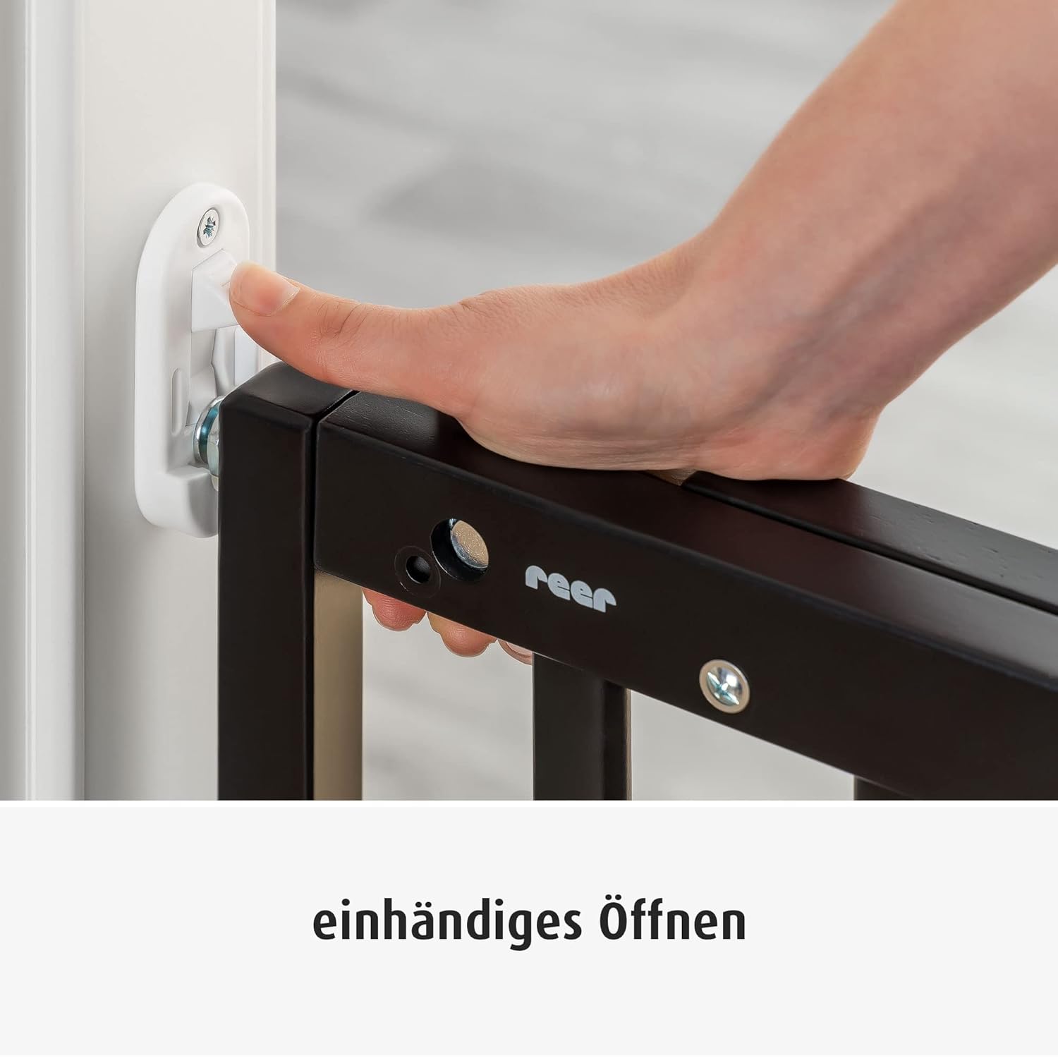 • Das Absperrgitter lässt sich bequem mit einer Hand öffnen und ist dank zwei Bewegungen trotzdem kindersicher.