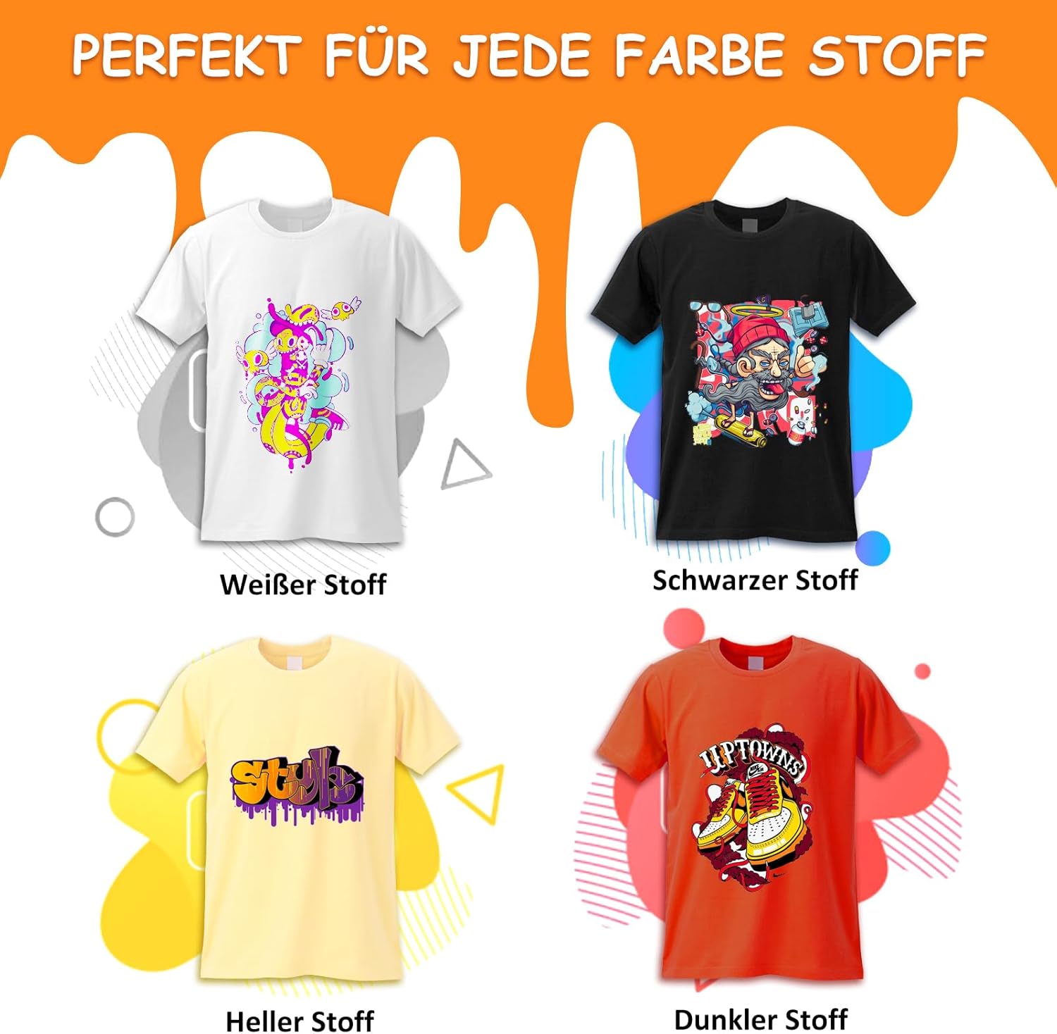 - Grosse Vielseitigkeit – unsere DTF-Folie bietet viel mehr Flexibilität als andere, da Sie auf eine Vielzahl von Stoffen drucken können, einschliesslich Baumwolle, Polyester, Viskose, Nylon, Seide, Leder und mehr. Unser DTF-Blatt funktioniert auch gut
