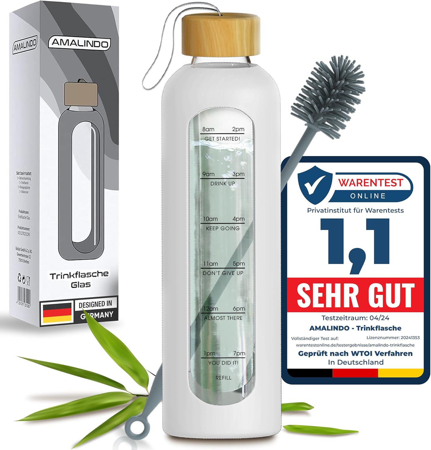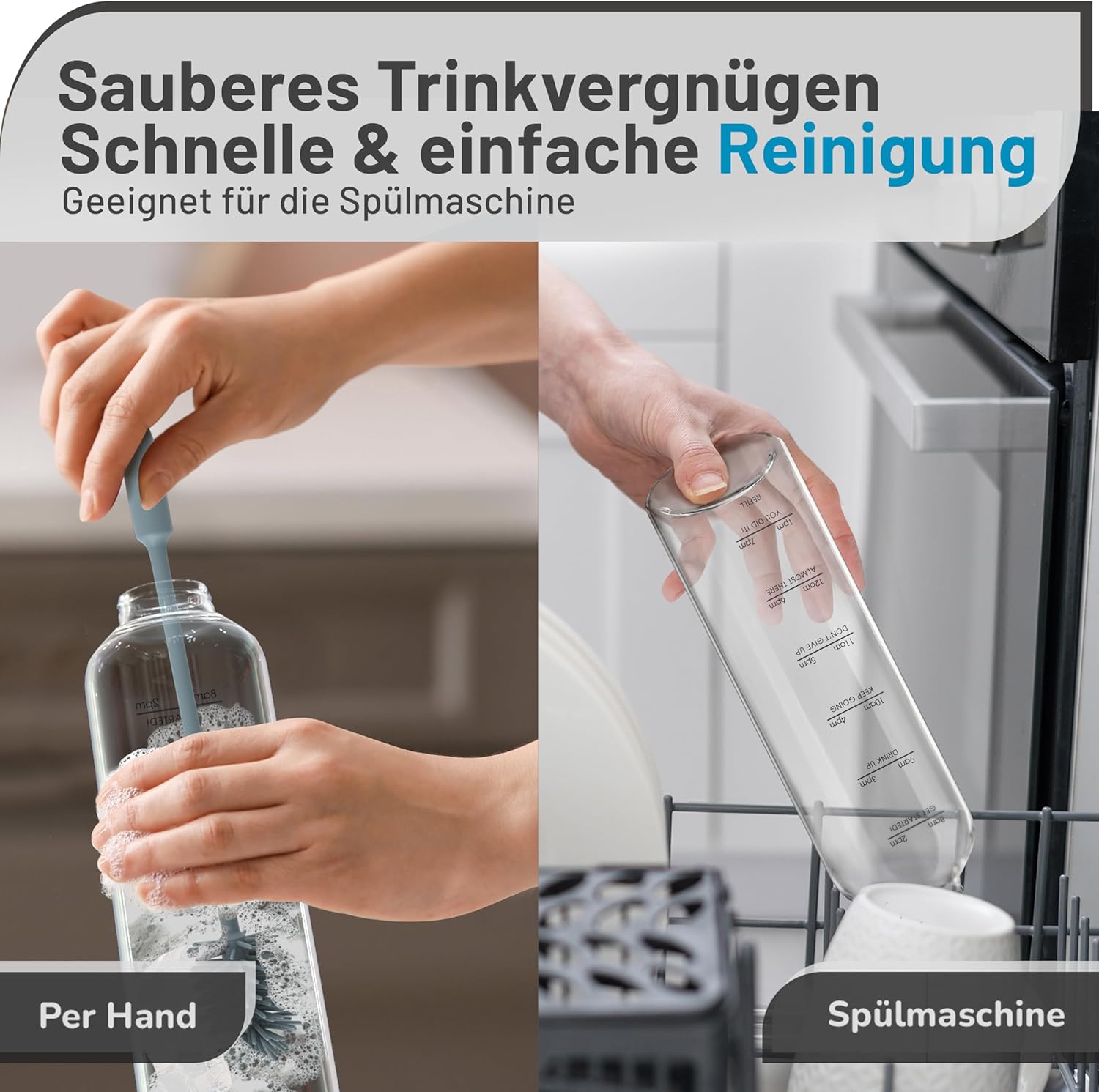 - BPA-FREI & SPÜLMASCHINENFEST - Sowohl die Glastrinkflasche als auch der Deckel und die Reinigungsbürste sind BPA-frei, frei von sonstigen Chemikalien und zur Reinigung in der Spülmaschine geeignet.