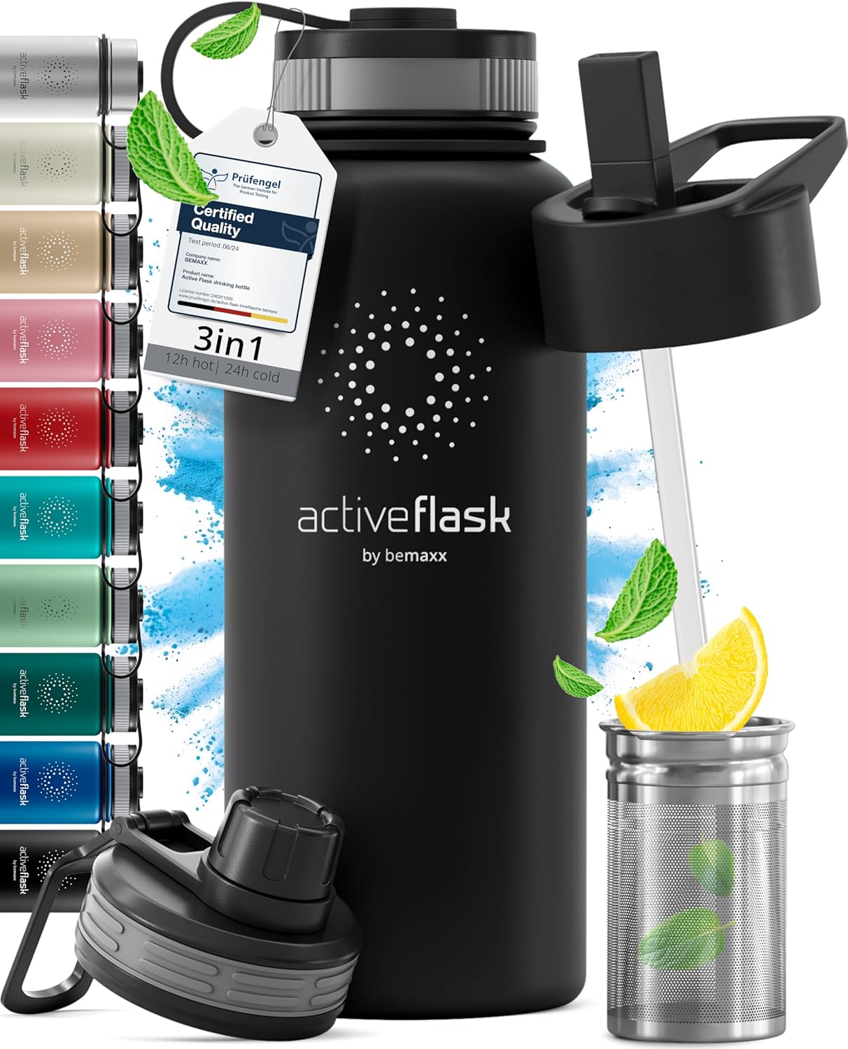 Trinkflasche Edelstahl ACTIVE FLASK + Strohhalm (3 Deckel) BPA-frei, Auslaufsicher, Kohlensรคure geei