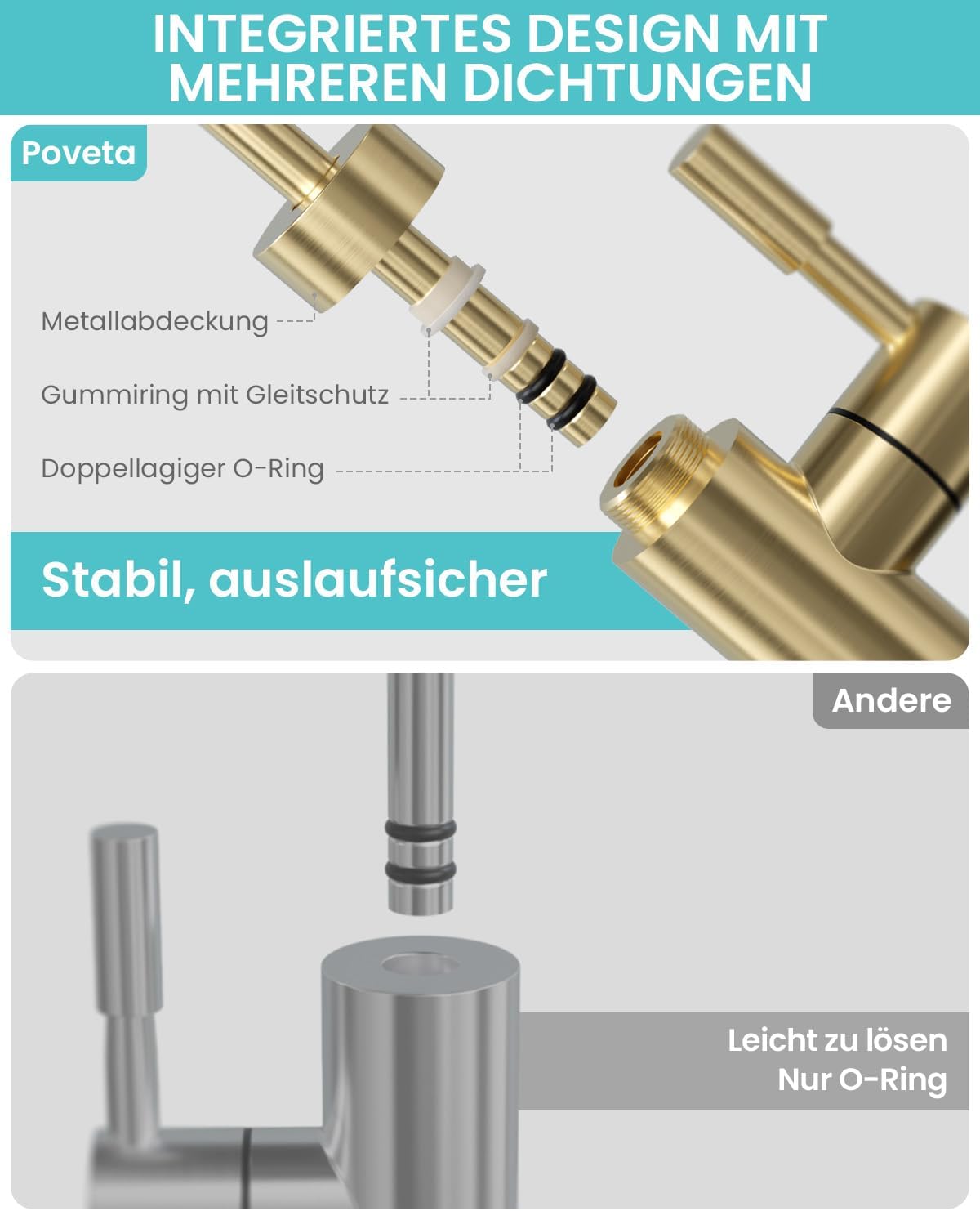 - GESUNDER TRINKWASSERHAHN: Povetas Philosophie ist es, sicherzustellen, dass jeder Tropfen Wasser, der durch den Wasserhahn fliesst, gesund und sicher ist. Wir verwenden lebensmittelechten Edelstahl für bleifreies Wasser. Im Vergleich zu anderen