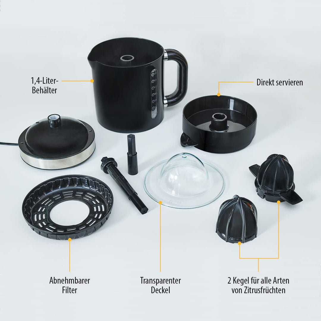 - Praktisches Design: Sie können den Saftausgiesser senken, sodass der frischgepresste Saft direkt in Ihr Glas läuft. Heben Sie den Saftausgiesser an, damit der Saft im Behälter (1,4 L) aufbewahrt wird.