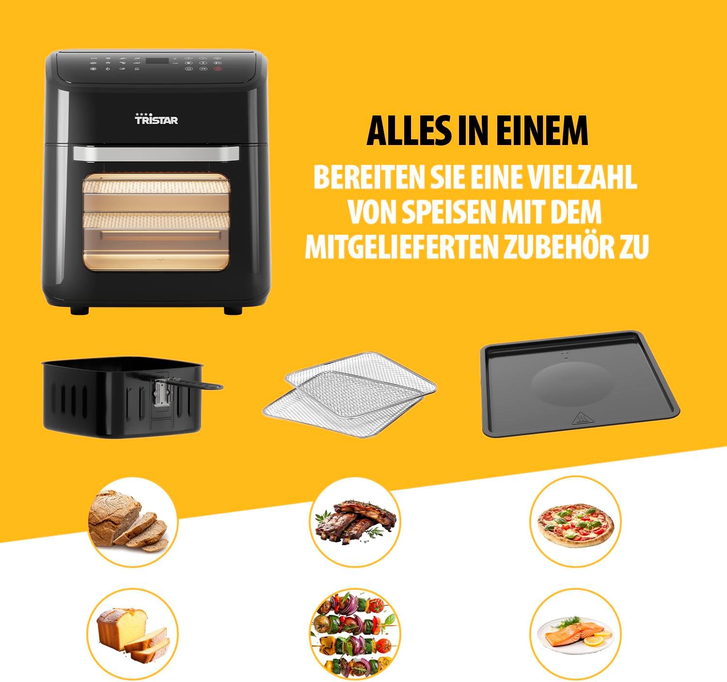 - 2-in-1: Tristar Airfryer ist Mini-Konvektionsofen und Heissluftfritteuse in einem – backen, braten, grillen, frittieren und dehydrieren. Inklusive Zubehör, um die vielseitigen Kochfunktionen voll auszuschöpfen.