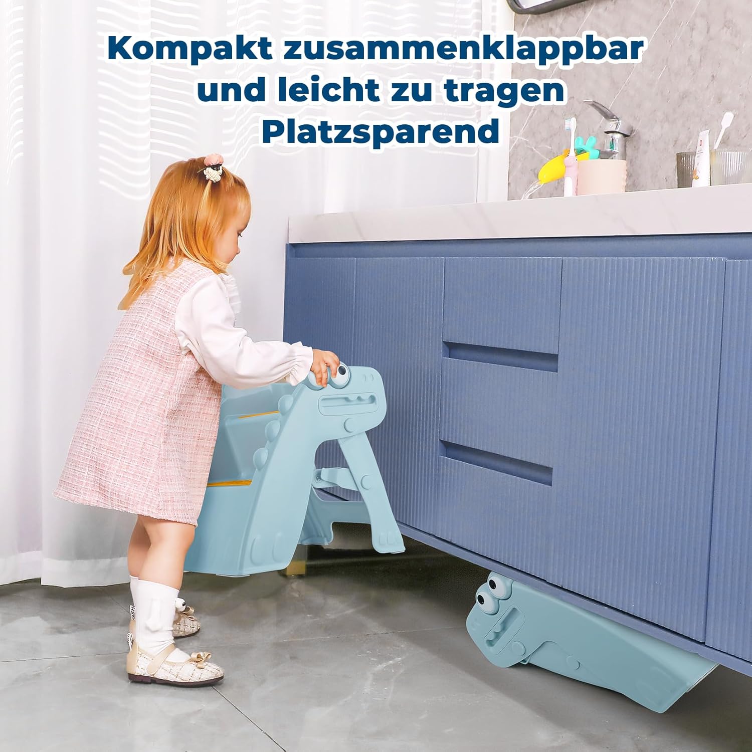 - 【Faltbar und einfache Lagerung】 Dieser Tritthocker Kinder ist einfach zu lagern, heben Sie einfach die Haken auf beiden Seiten an, um ihn leicht zu falten. Es dauert nur ein paar Sekunden, um für die Verwendung zu entfalten und für die Lagerung zu