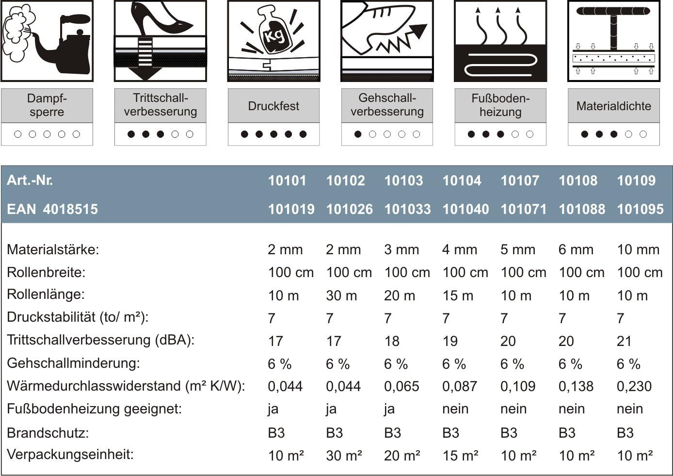 - Trittschallverbesserung ca. 19 dB(A) / Wärmedurchlasswiederrstand: 0,087 m² K/W