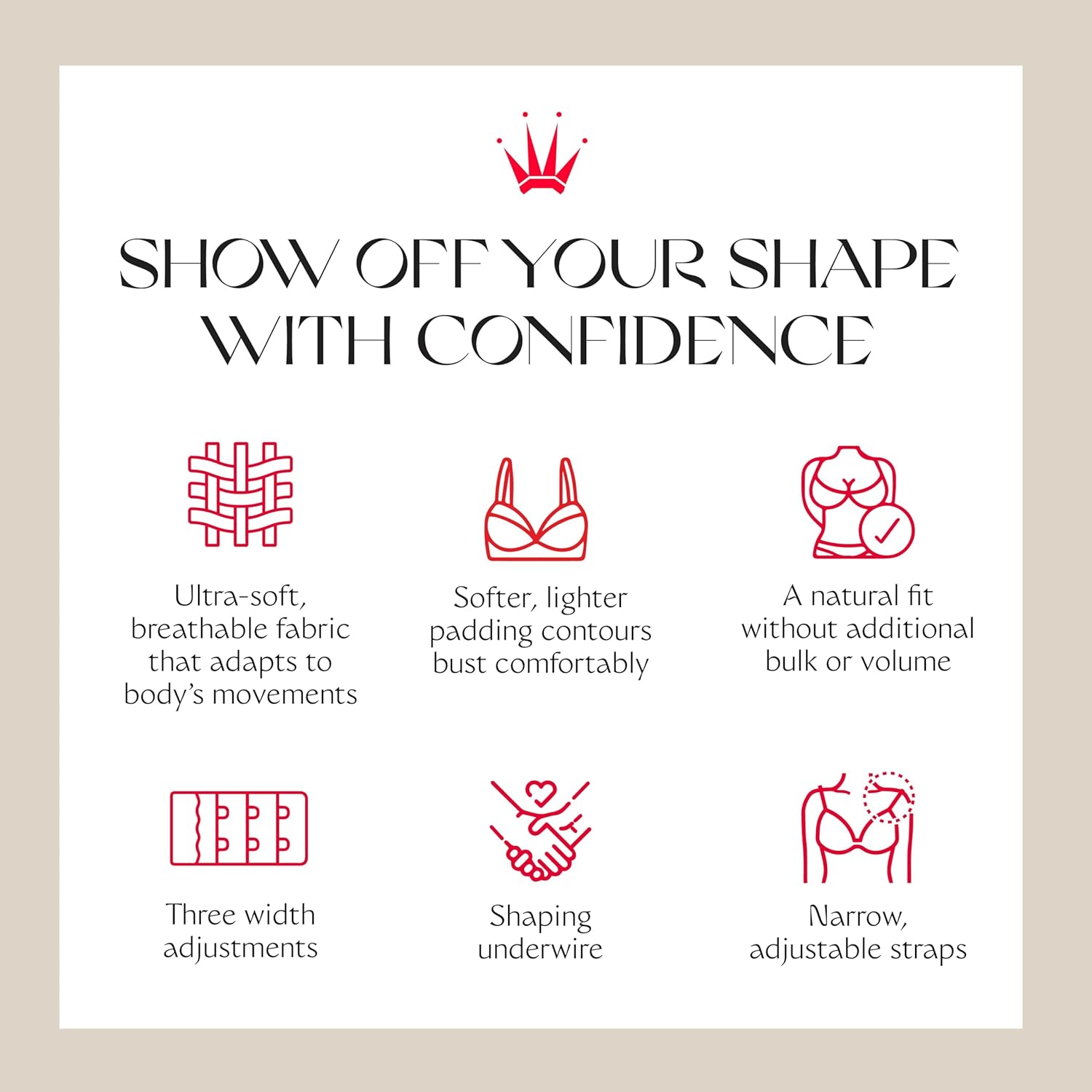 PRODUKTBESCHREIBUNGEN Der extrem weiche Body Make-Up von Triumph ist durch seinen bequemen Tragekomfort der perfekte Begleiter für jeden Tag. Dieser T-Shirt BH zeichnet sich durch seine besonders atmungsaktive Qualität aufgrund der Spacer Cups aus. Ausserdem macht ihn die nahtlose Verarbeitung unter engen Oberteilen unsichtbar. Durch dünne und leichte Pads passt sich der BH der Brust an und verleiht eine tolle Form, ohne zusätzlich aufzutragen. Der BH gibt der Brust optimalen Halt durch seine Halbschalen Bügel-Konstruktion, längenverstellbare Träger und einen dreifach verstellbaren, nickelfreien Haken-Ösen-Verschluss. Der Lycra-Materialbestandteil sorgt für Elastizität und unterstreicht den hohen Tragekomfort. Die Kombination aus sexy Look und angenehmem Tragegefühl machen den Body Make-Up BH zu einem Must-Have in jedem Kleiderschrank. Nicht bleichen ; Nicht in den Trockner ; Nicht bügeln oder drücken ; Nicht chemisch reinigen Mehr