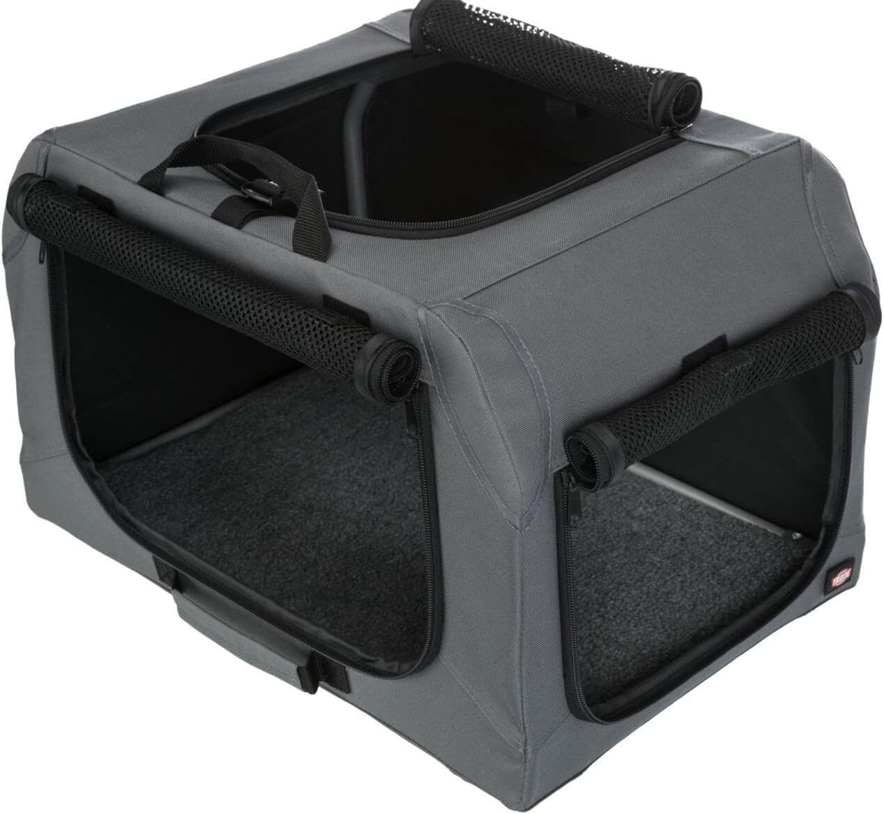 PRODUKTBESCHREIBUNGEN Trixie Soft Kennel Easy Travel Bench Grau 50 x 36 x 33 cm Die Trixie Soft Kennel Easy Travel Bench Grey 50 x 36 x 33 cm ist eine Reisebank für den Hund, mit stabilem Metallrahmen, Stoffumrandung und Schlafmatte in Schaffelloptik. Ideal, um Ihren Hund oder Ihre Katze auf einen Besuch, einen Ausflug oder zu Messen und Ausstellungen mitzunehmen! Diese leicht aufzubauende mobile Hundehütte besteht aus einem stabilen Metallrahmen mit einem Gestell aus Polyester. Die Netzeinsätze sind leicht aufzurollen und sorgen für eine gute Belüftung. Die Kiste kann an drei Seiten geöffnet werden, um den Zugang zum Tier zu erleichtern, und lässt sich dank der drei Griffe leicht bewegen. Die Kiste ist mit einer Matratze in Schafsfelloptik (Polyester) ausgestattet, die dem Tier mehr Komfort bietet. Die Form und das Aussehen der Kiste machen sie vielseitig verwendbar. - Mobile Softbox für Hunde aus Polyester - Ideal für Reisen, Besuche oder Ausstellungen - Kann an drei Seiten geöffnet werden - Mesh-Einsätze für ausreichende Belüftung - Mit Liegematte - Ausgestattet mit einem Stahlrahmen für viel Stabilität Abmessungen: 50 x 36 x 33 cm .