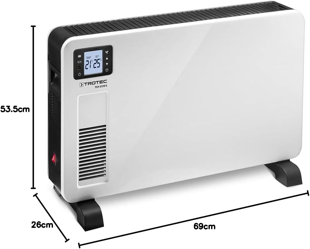 - Gemeinsam haben die technisch baugleichen Heizgeräte ein elektrisches Heizelement mit 2.300 Watt Heizleistung und Thermostatsteuerung, um Räume bis zu einer Grösse von 27 m² bzw. 67 m³ mit drei Heizstufen (1.000 W, 1.300 W, 2.300 W) gleichmässig und gradgenau auf die gewünschte Raumtemperatur im Temperaturbereich von 5 bis 37 °C zu beheizen.