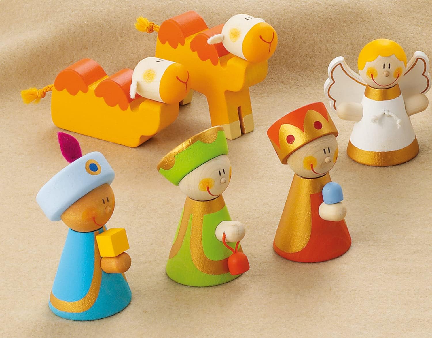 • 20-teilige Holzkrippe mit schönen 3D Figuren und sichtbar viel Liebe fürs Detail, bestehend aus: Josef, Maria, Jesus, Esel, Ochse, Holzkrippe, Hirten, Schafen, drei Königen, Kamelen, Engel und Palmen