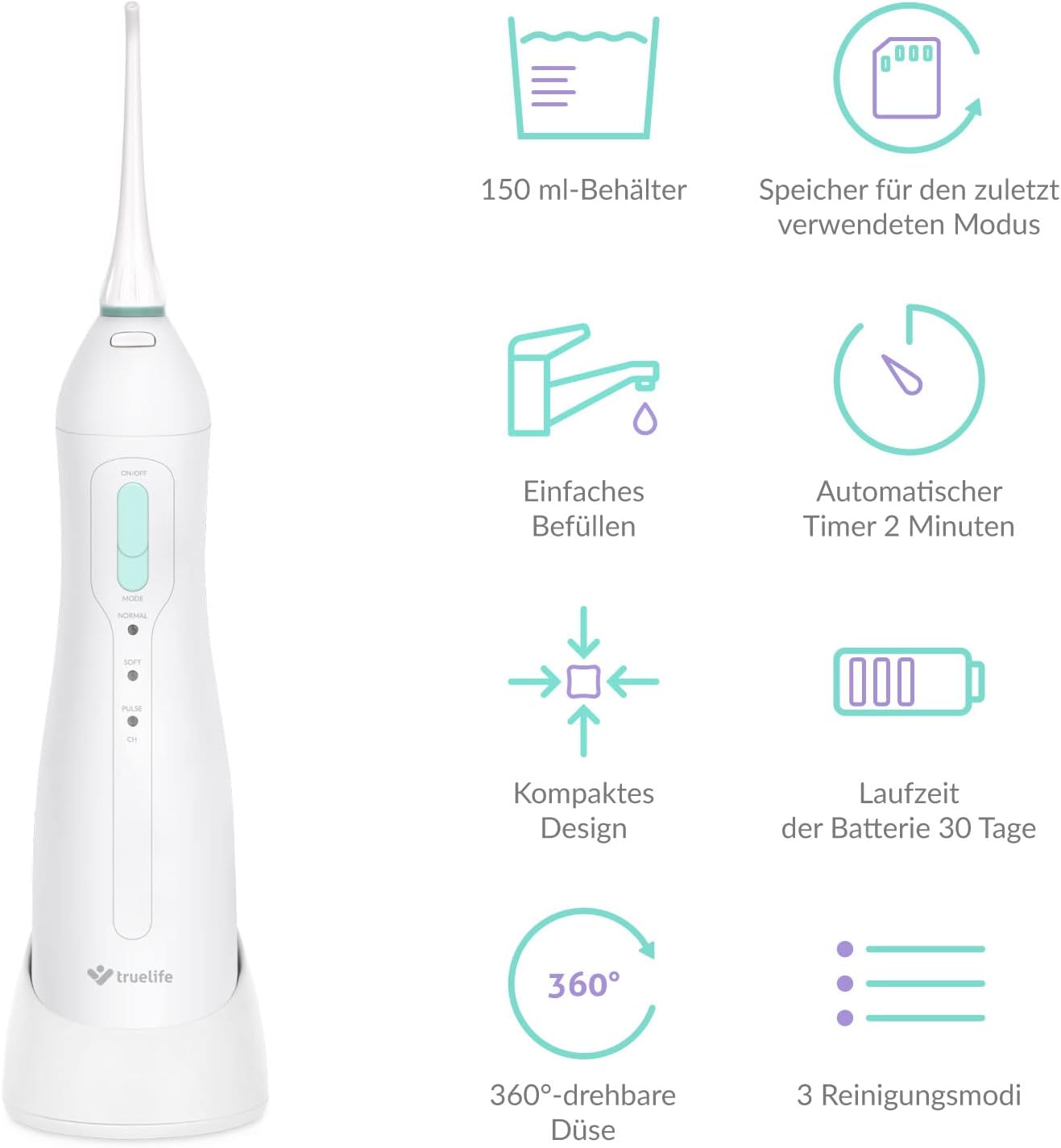- BEHÄLTER 150 ML - Der Behälter mit einem Volumen von 150 ml genügt zur Reinigung der gesamten Gebisses. Gleichzeitig ist er so kompakt, damit die Munddusche überall Platz hat.