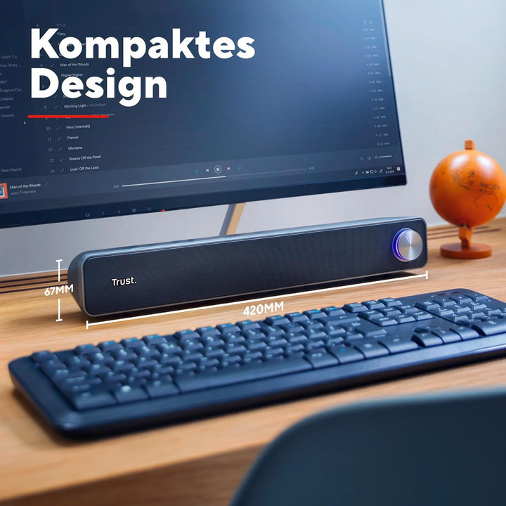 - HOCHWERTIGER SOUND – Mit einer Spitzenleistung von 12 W haut die kompakte PC-Soundbar ganz schön rein. Das klare Audio macht jede Show und jedes Video zu einem wahren Ohrenschmaus.