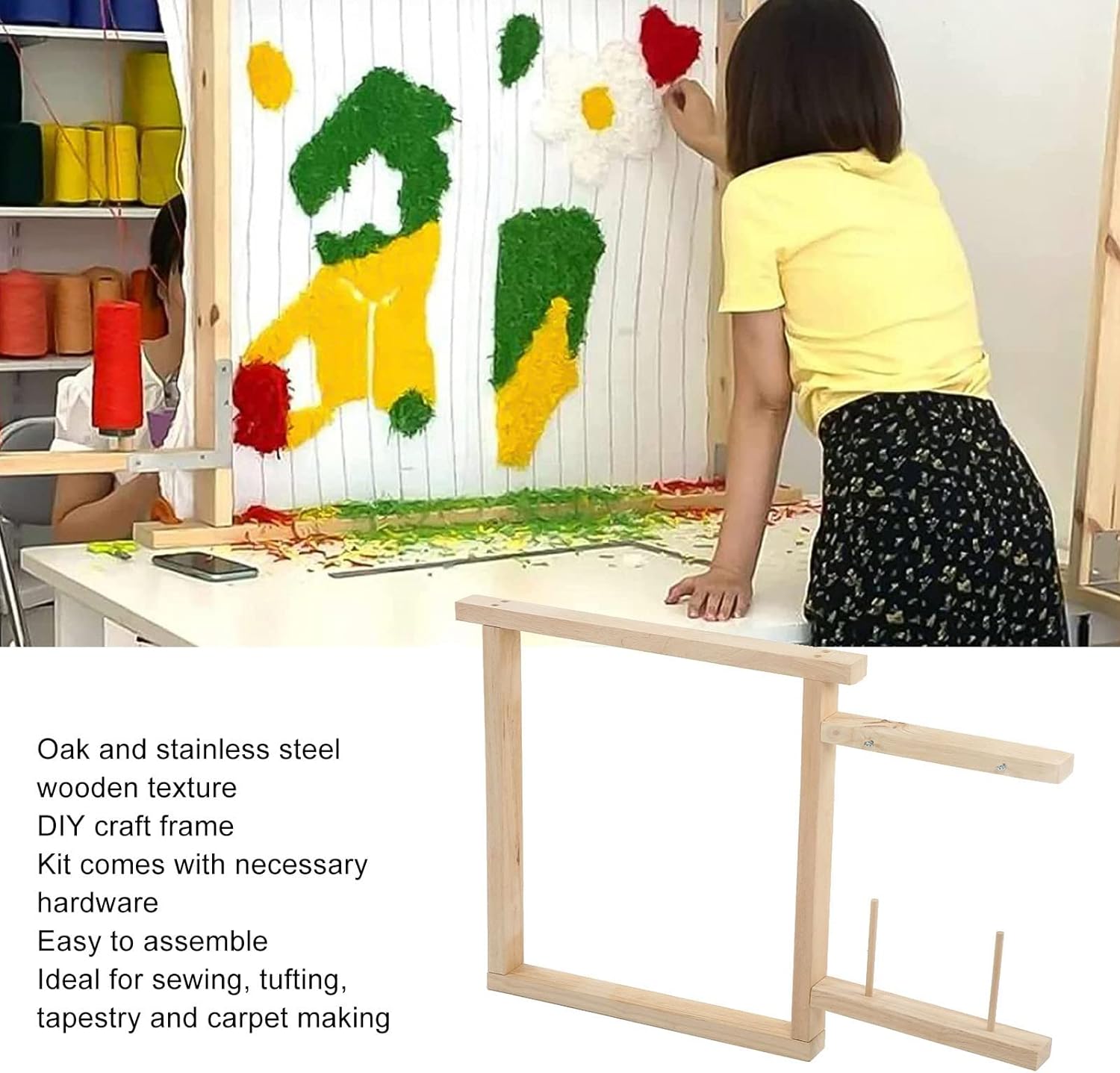 • Edelstahl: Der Tuftingrahmen besteht aus Eichen- und Edelstahlmaterial mit Holzstruktur und feiner Verarbeitung