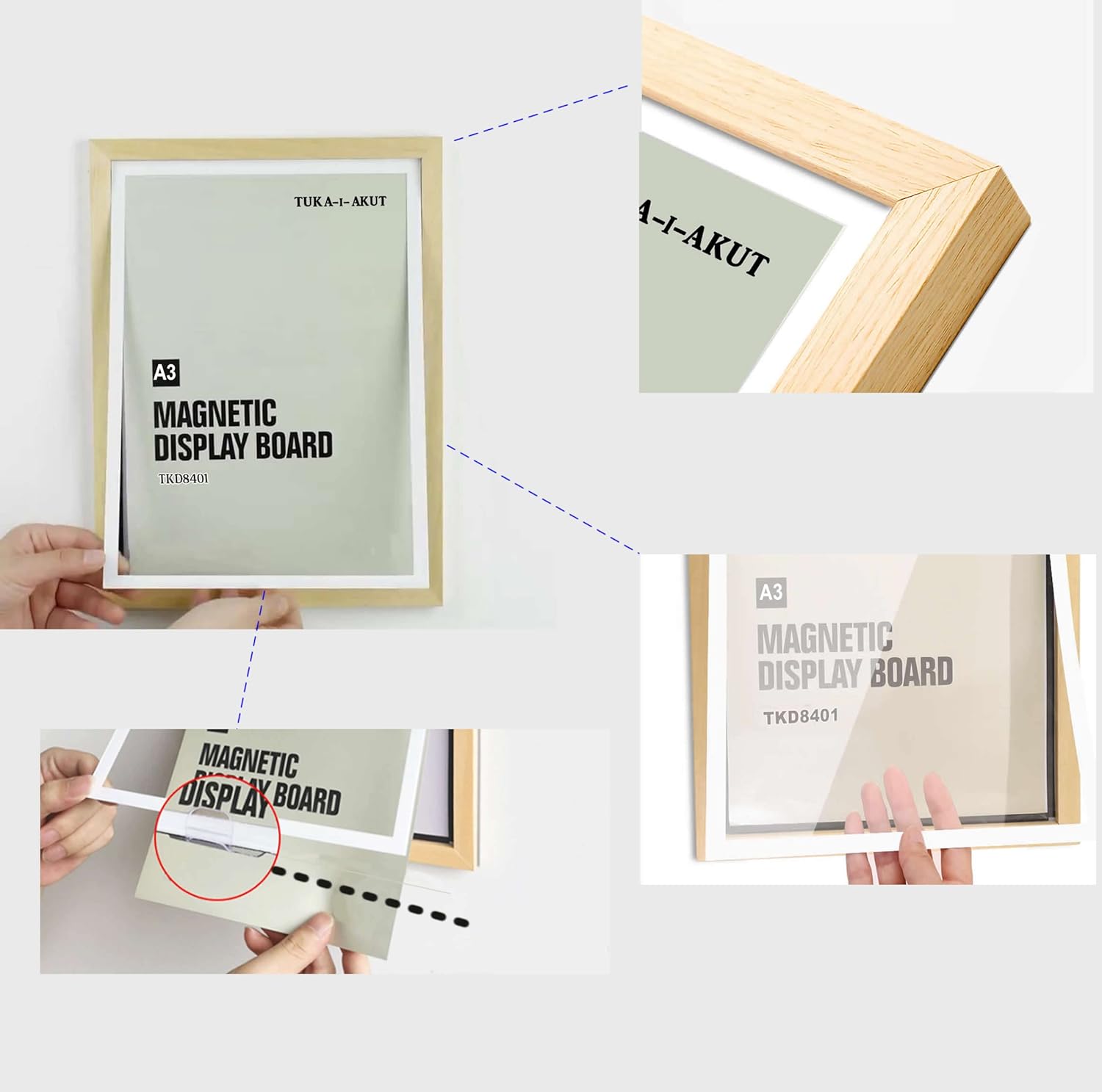 - [ 4er Set ] DIN-A3 Holz Info-Rahmen mit Acryl Frontfolie und aufklappbarem Magnetrahmen, für professionelle flexible Präsentation und Schnelles Wechseln von Dokumenten, Aushängen, Kunst, Poster, Informationen, Werbung, Angeboten, Plakate, Zertifikate,