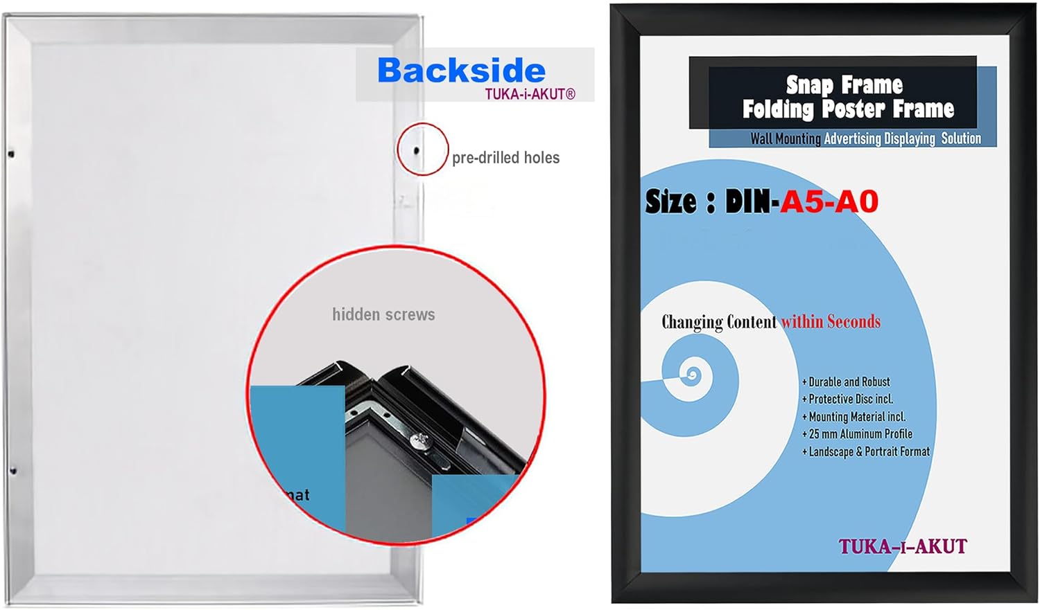 - [ A2 Quer- und Hoch-Format Verwendbar ] TUKA-i-AKUT Plakatrahmen Wechselrahmen sind geeignet für Quer- und Hoch Format: geeigent für Schild / Papiereinlagen Format A2 in Grösse von 420mm × 594mm. TUKA-i-AKUT Klapprahmen sind verfügbar in