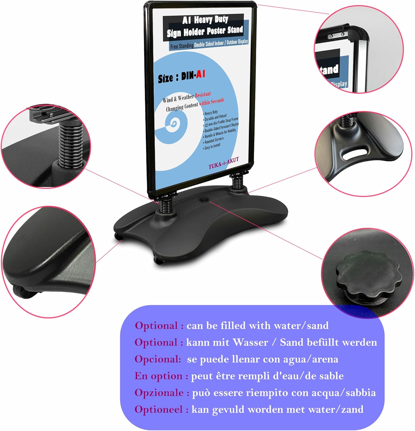 - [ Sicher Stand und Schutz ] Der Bodenständer Kundenstopper verfügt über einen stabilen Standfuss zum Befüllen mit Wasser oder Sand. Wasser befüllt hat der Fuss c.a. 36 kg Gewicht und der gesamte Plakataufsteller c.a. 45 kg Gewicht. Zusammen mit 2