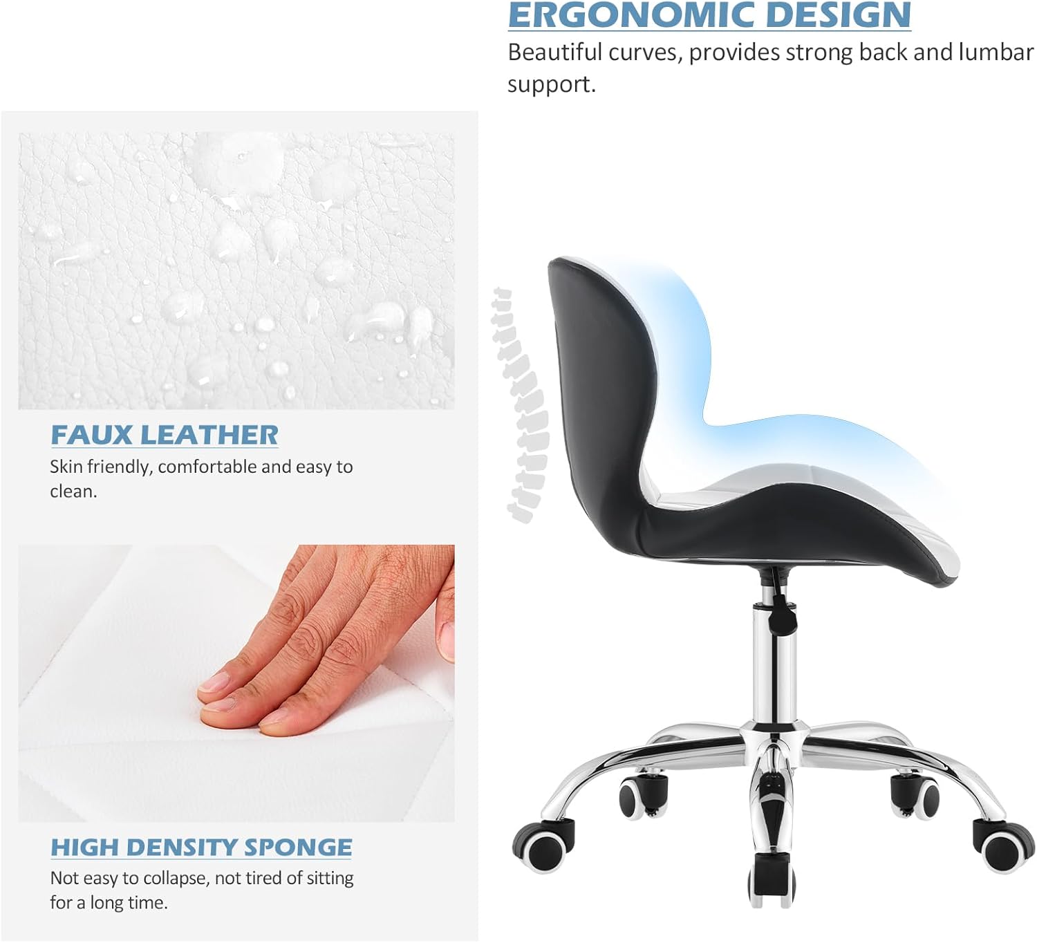 • 【Kunstleder-Drehstuhl im Color-Blocking-Design】Die Sitzfläche ist mit Kunstleder bezogen, mit einer glatten und zarten Textur, praktisch, verschleissfest, wasserdicht und bequem für die Reinigung. Die vordere und hintere zweifarbige Design und