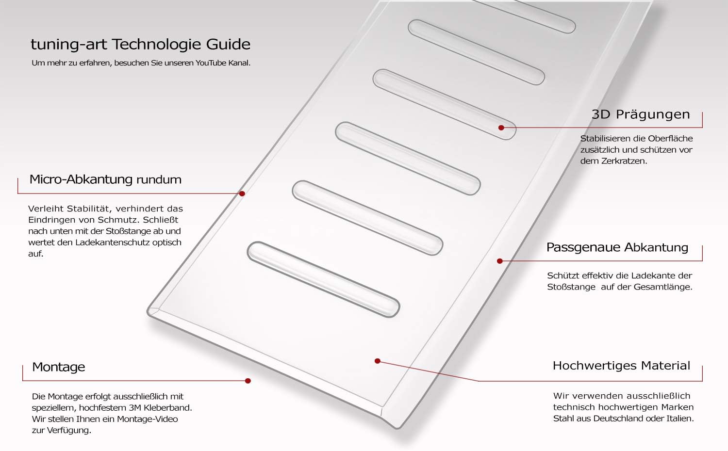 - Lieferumfang: Ladekantenschutz aus rostfreiem Edelstahl, Montageanleitung, Videoanleitung