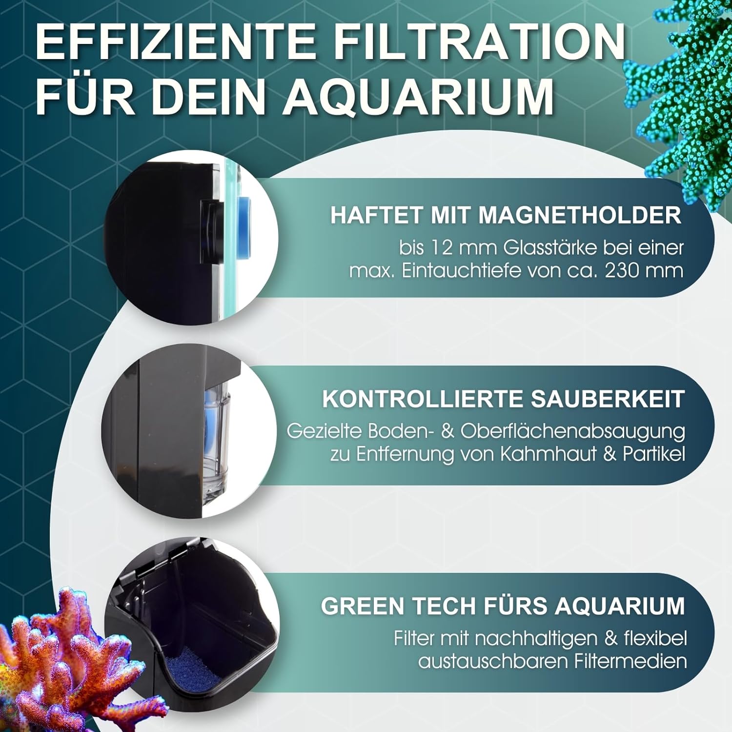 - Geeignet für Süss- und Meerwasseraquarien je nach Beckenbelastung von 60 bis 400 Liter