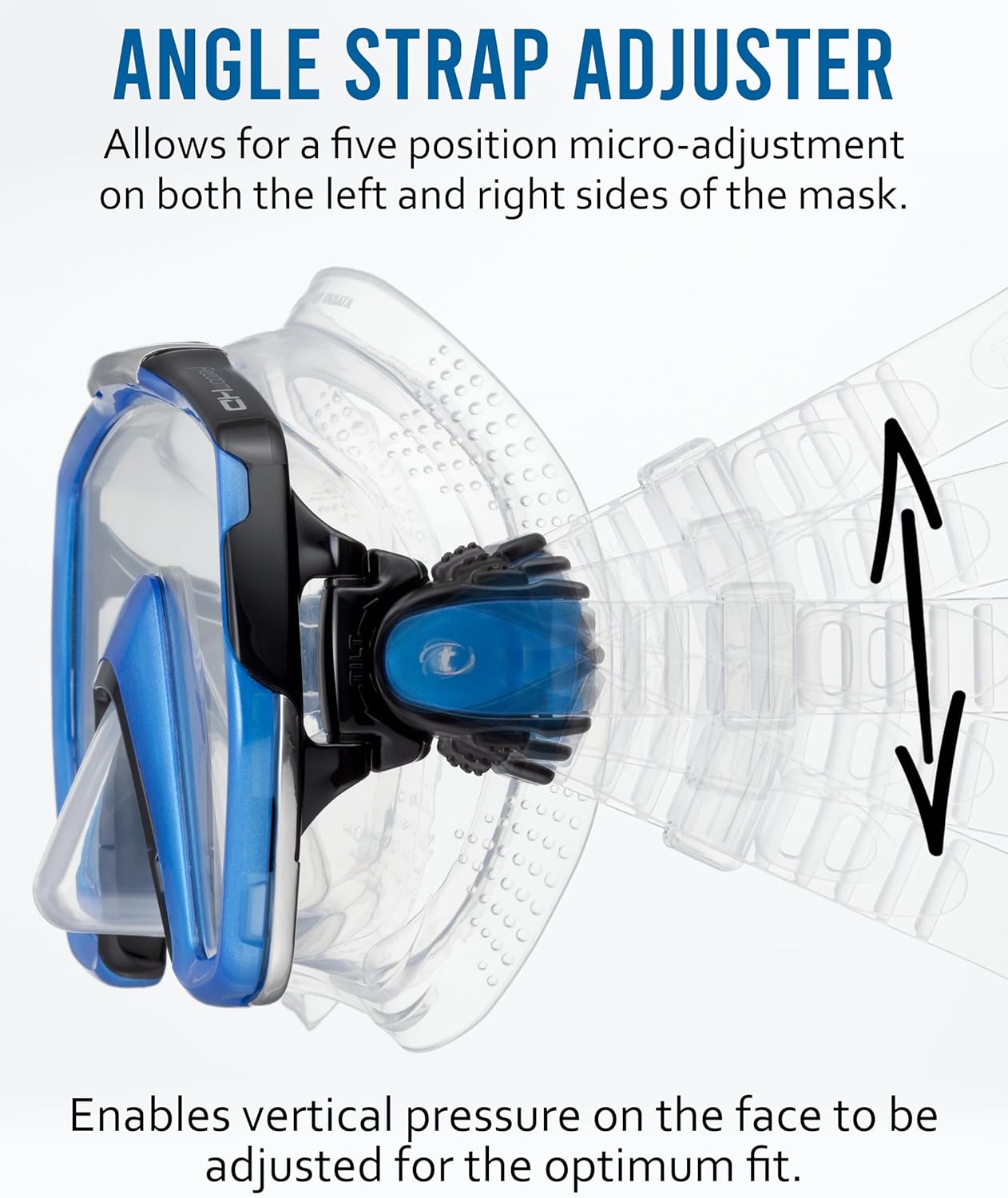 - 186 Buckle System die Schnalle dreht eine volle 180 Grad essentiell, um verschiedene Kopfgrössen für optimale Passform. Die dünnen Rahmen und Drehung der Schnalle ermöglicht die Maske zu in einer kompakten Grösse gefaltet werden.