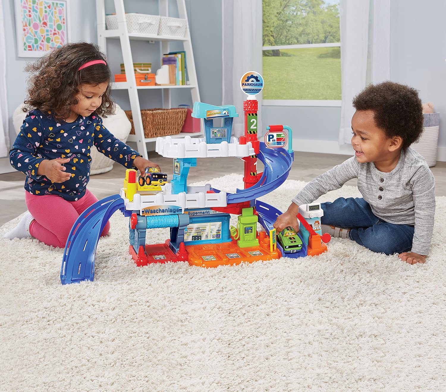 PRODUKTBESCHREIBUNGEN Auf geht die rasante Fahrt durch das Parkhaus! Grosses, realistisch gestaltetes Parkhaus auf 3. Etagen zur Förderung der Motorik und des Rollenspiels. 2 grosse Rampen für rasanten Flitzerspass. Realistisches Design durch bewusste Farbgebung der Strassen und des Parkhauses. 6 auffallend bebilderte magische Sensoren lösen bei den Tut Tut Baby Flitzern lustige Sätze, Melodien, Lieder und Geräusche aus. Die grossen Abbildungen auf den magischen Sensoren geben einen Anhaltspunkt, was für Sätze, Geräusche etc. bei den Flitzern ausgelöst werden. Zahlreiche realistische, interaktive Elemente, die durch Aktionstasten in Bewegung gesetzt werden und bei den Flitzern realistische Geräuscheffekte auslösen: Autowaschanlage mit drehbarer Reinigungsbürste. Hebebühne, um die Flitzer auf und ab zu bewegen. Tuning-Station lässt den Flitzer vibrieren. Tankstelle mit änderbarer Tankanzeige. Beweglisches Parkschild und 2 Schranken. Verpackung mit naturgetreuem Hintergrunddesign. Stabiles Tut Tut Baby Flitzer Spielset. Inkl. Tut Tut Baby Flitzer - Rennauto