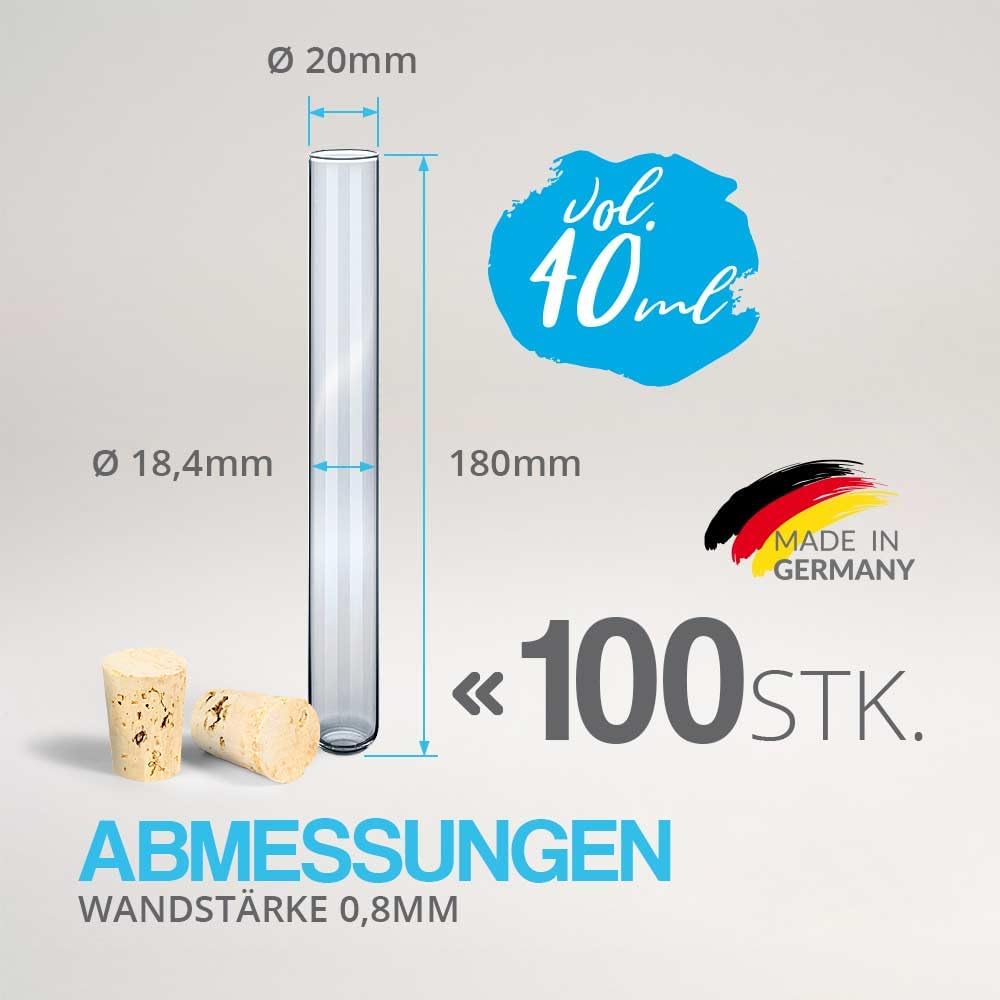 - Abmessungen Reagenzglas - Höhe = 180mm / Durchmesser = 20mm / Wandstärke = 0,8mm / Innendurchmesser = 18,4mm / Volumen = ca. 40ml